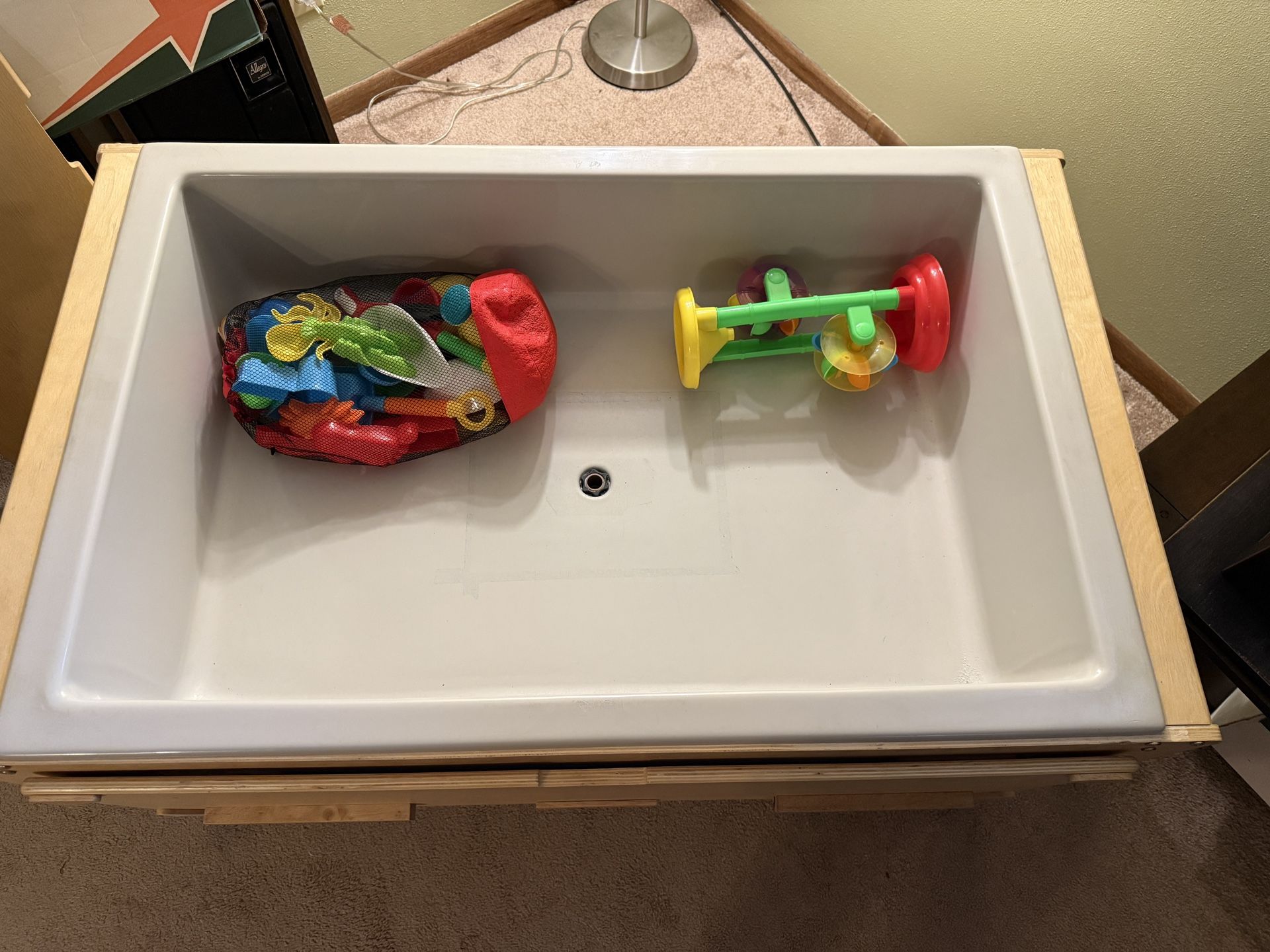 Kaplan sand and water table. In good condition. Toys included. Had to seal the gasket around the drain due to leaking. Drain still works and bin is removable for cleaning.