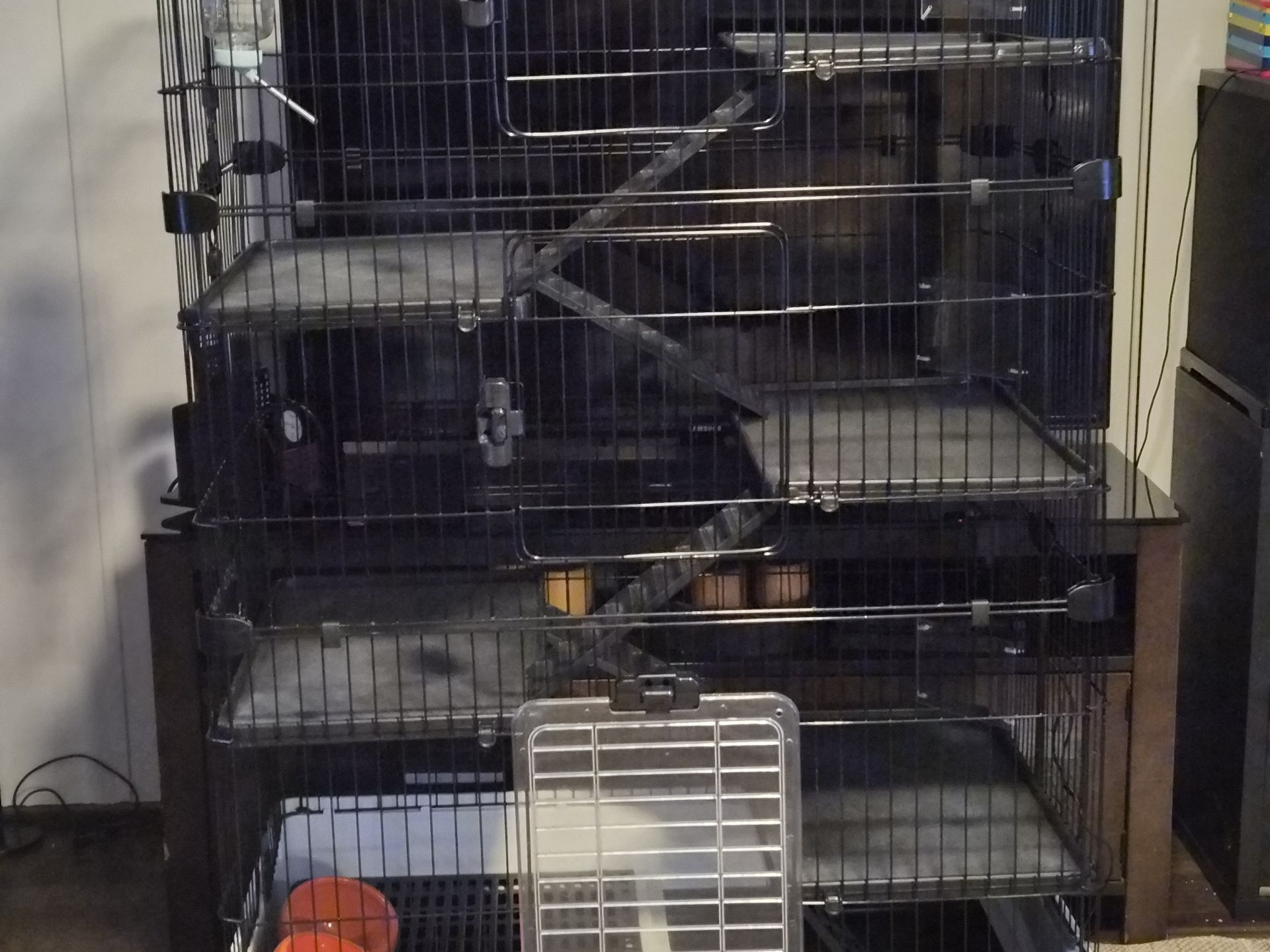 Large cage for ferrits or mabey other small animal. Measures 5foot by 3 foot bt 2 foot. Huge 6 levels, 3 doors and 2 bottom drawers below for easy cleaning and feeding and on wheels. Measures 61" ×36×24.
