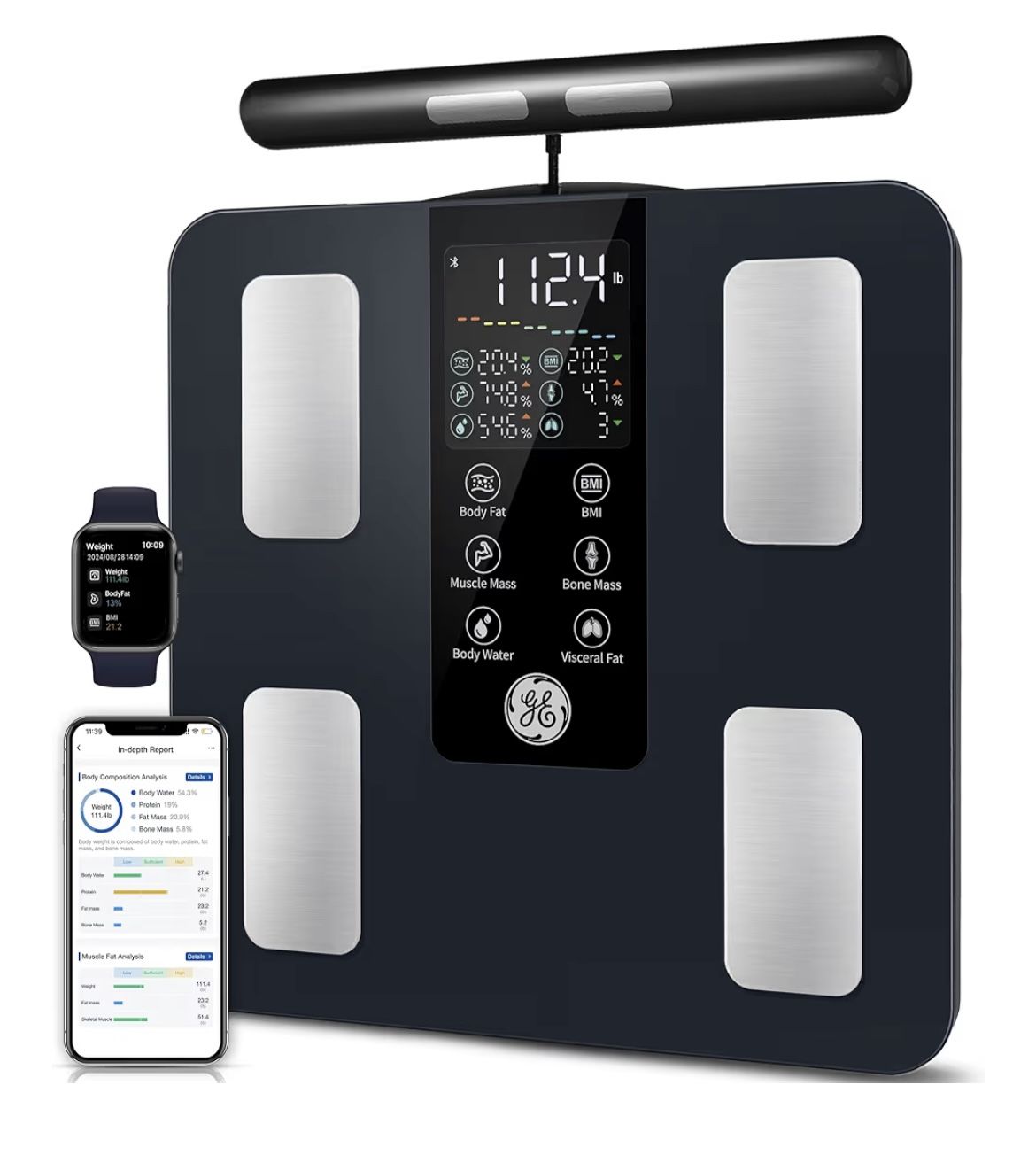 GE Smart Scale for body weight : 8- electrode digital bathroom scale for weight fat BMI muscle mass full body composition analyzer 27 measurements Bluetooth Retails for $100 Our price $65 Can be purchased at Treasures Depot 9207 Broadway Ave Brookfield Illinois