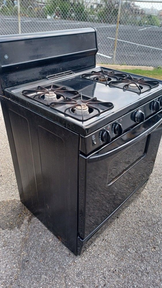 Black GE gas stove. Works good. Has some overspray needs cleaning. Pick up in southeast Houston