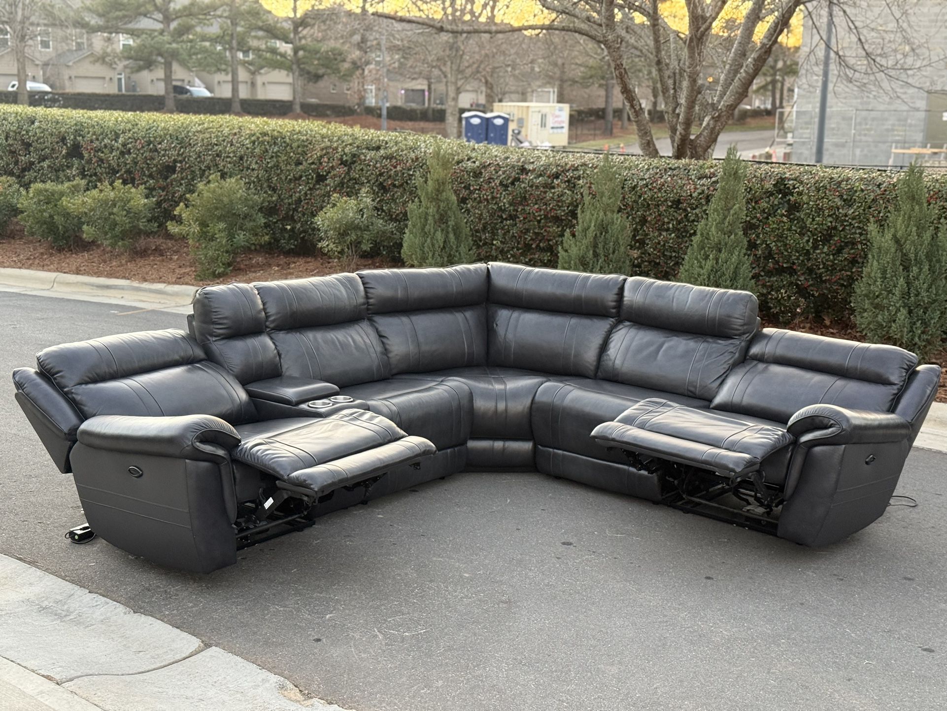 Modern leather sectional sofa with 4 recliners — 2 power recliners and 2 manual recliners. Features plush seating, deep cushions, and a built-in center console with cup holders and storage. Very comfortable, well-kept, and perfect for a living room or media room.