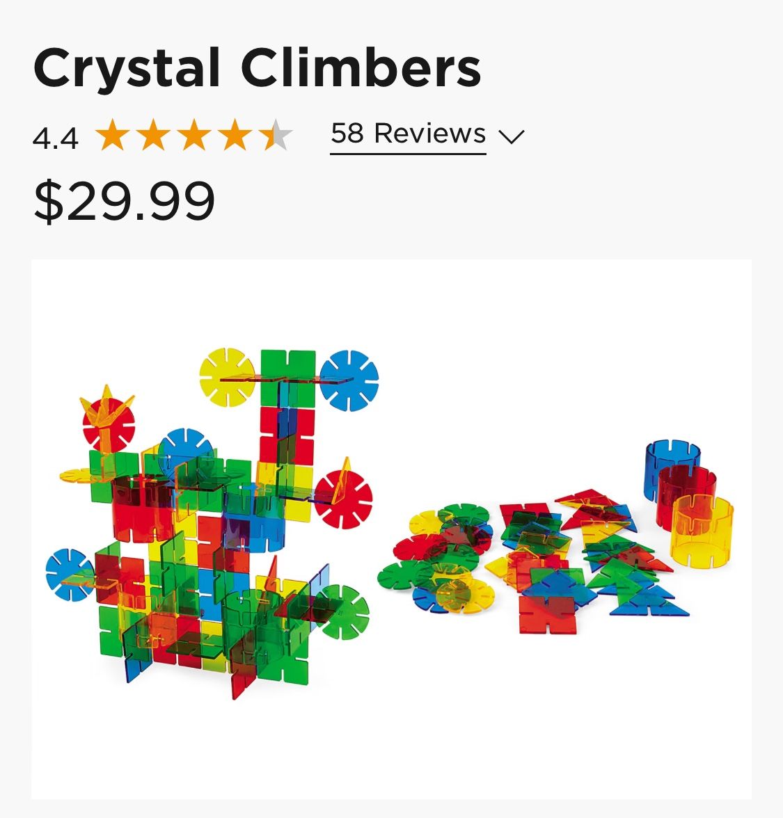 Description These unique, see-through builders let kids create cool, colorful designs that “climb” in all directions! The 172 plastic pieces come in 4 fun shapes and 4 bright colors…and feature a special slotted design that makes them super-easy to slide together. The cylinder pieces measure 2" tall. Item # LK467