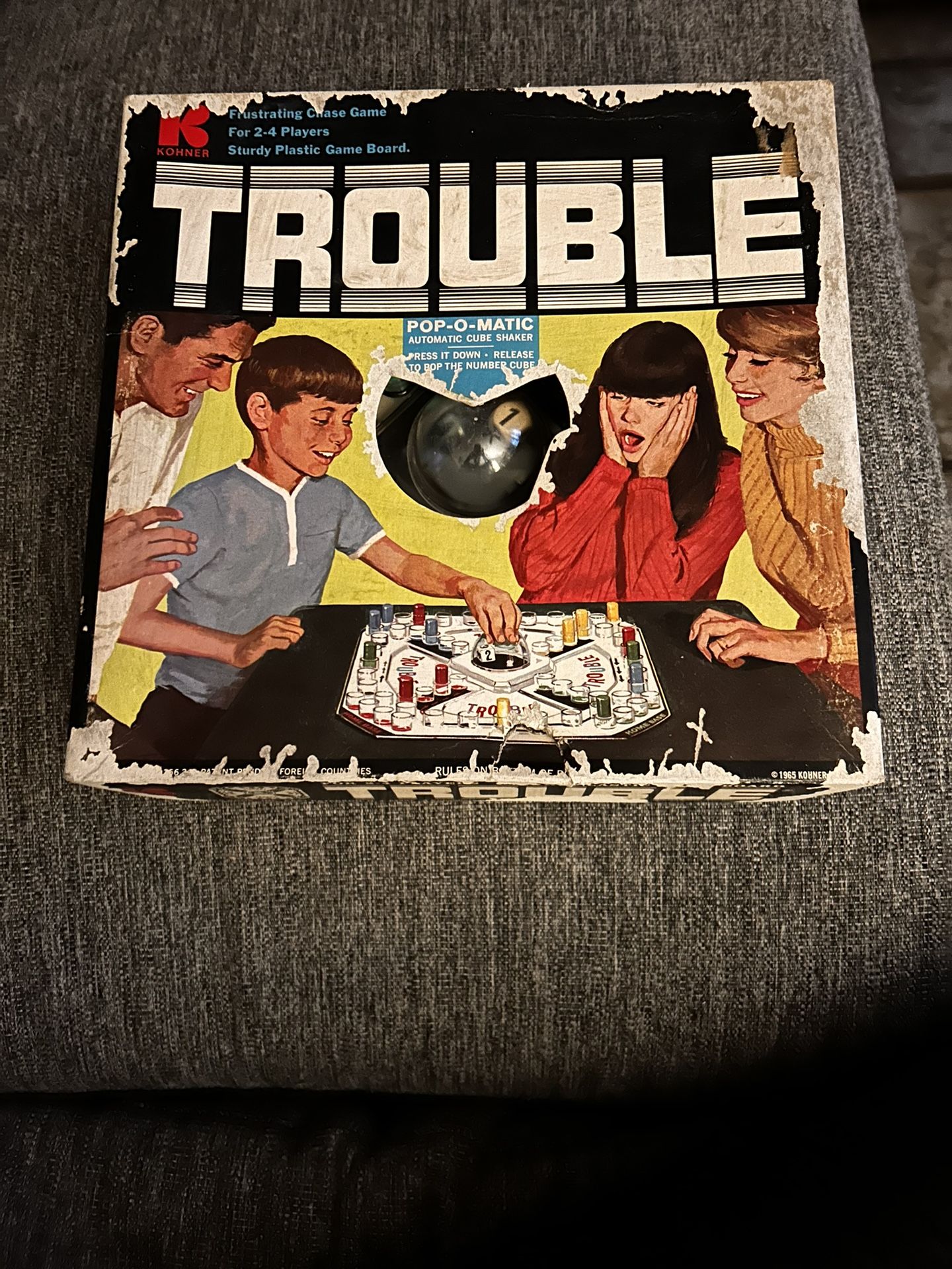 This is a vintage 1965 Trouble board game. The box is intact, but has seen better days as far as the artwork on the sides. Also, when I acquired it, there were only two original game pieces, but I replaced them with trouble game pieces I found online. The game board itself is great and the pop-o-matic works perfect.
