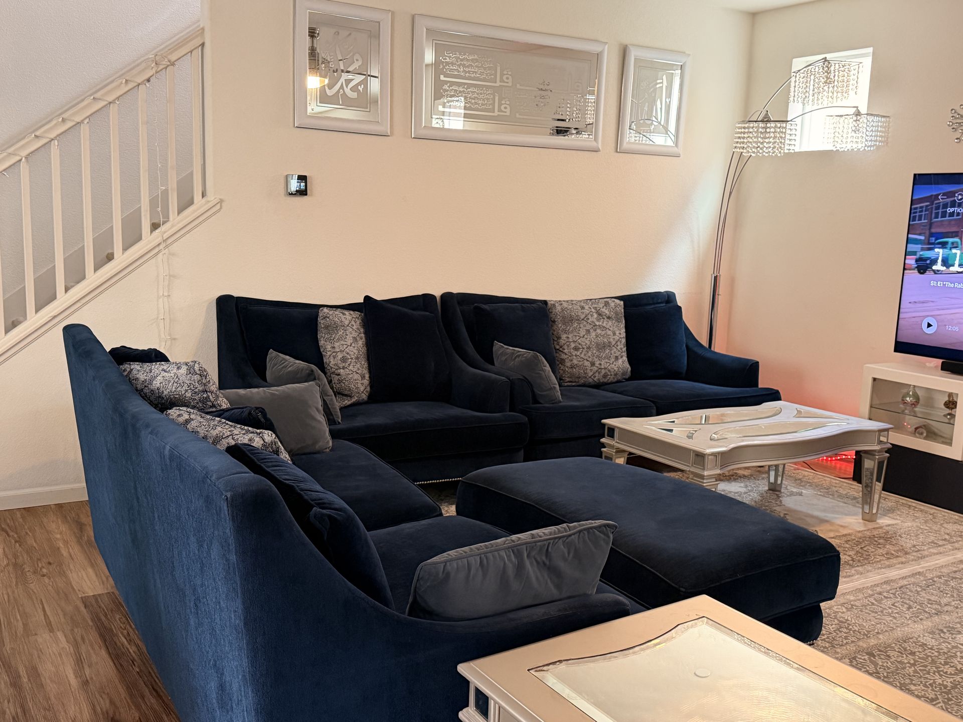 Fairmont designs Navy Blue Couch Silver Coffee table Side Table Quality is still top notch Selling because we need a bigger set Originally Bought for $5000