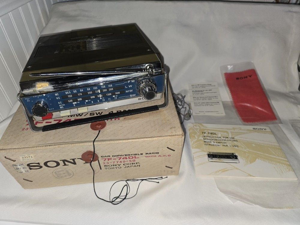 A vintage portable radio/ car radio. 3D-sized batteries, minor scuffs, and the antenna tip broken, still works, tested everything works. Comes in original box and owner's manual and other accessories from the late 1960s or early 1970s. Made in Japan. Cash and pick up only 5th st close to East Valley Water District SanBernardino.