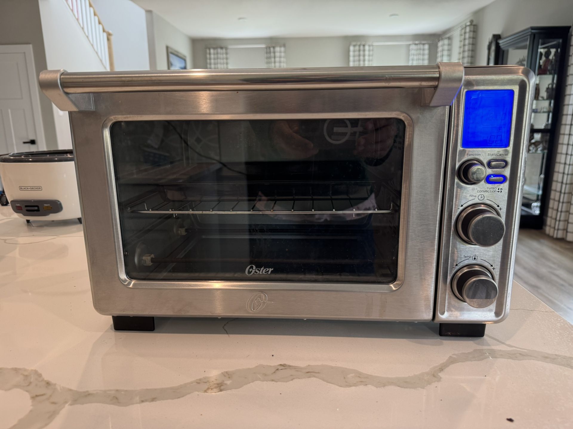 The Oster TSSTTVDFL1 Digital Toaster Oven in Silver is a versatile countertop oven that offers a maximum timer setting of 60 minutes. With a power source of 1400W and made of steel with a stainless steel finish, this electric oven is designed for baking, broiling, and toasting. It features a convection oven for even cooking and has dimensions of 11.6 inches in height and 18.5 inches in width. Countertop convection oven features convection technology for fast, even heating Digital settings for pizza, bake, broil, toast, and defrost Large interior fits 2 take and bake pizzas, a family sized chicken Easy clean interior and with auto shut off feature Includes 2 oven racks
