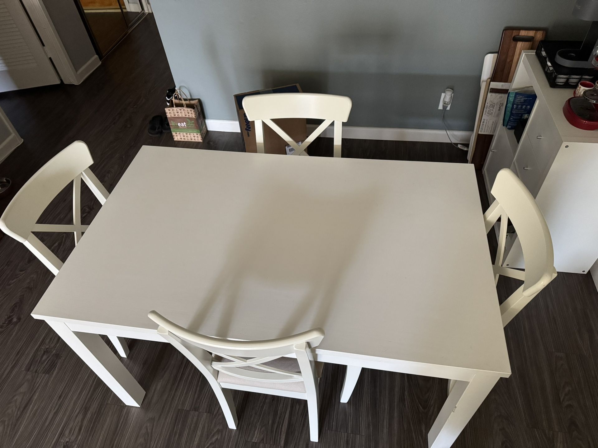 Selling expandable table and 4 chairs. Table measures 51” L x 31.5” W x 29” H without the leaf. With the leaf in, it expands to almost 75” L. The table is in great condition and is used daily, but my movers broke the piece that allows you to move the tabletop to expand it. It’s completely fixable, but I don’t have a desire to do that. I’ve added a photo to show the part that broke (last photo). Pictured is also some damage to 2 table legs. This damage can easily be sanded and repainted. Sorry to see this piece go, but it’s time to upgrade