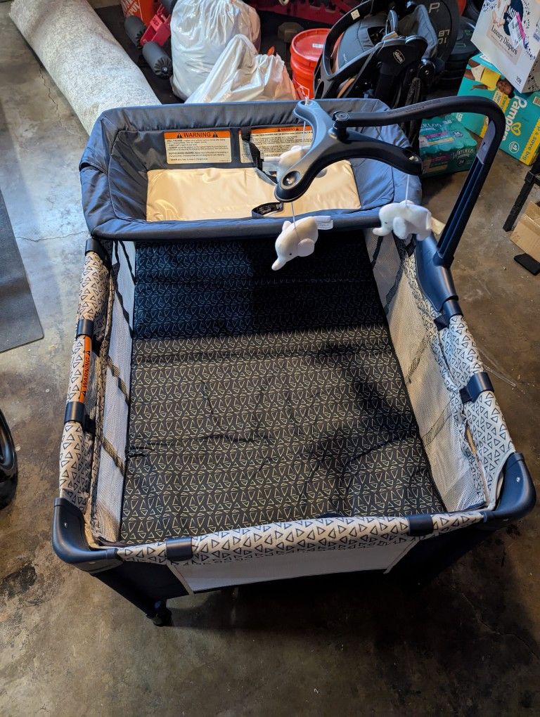 This listing is for a like new Delta Children LX Deluxe Portable Baby Play Yard With Removable Bassinet and Changing Table, Eclipse This was only used once for a 6 month old baby. Everything is in like new condition. For your reference: https://offerup.com/redirect/?o=aHR0cHM6Ly9hLmNvL2QvaXpydXdoRA==