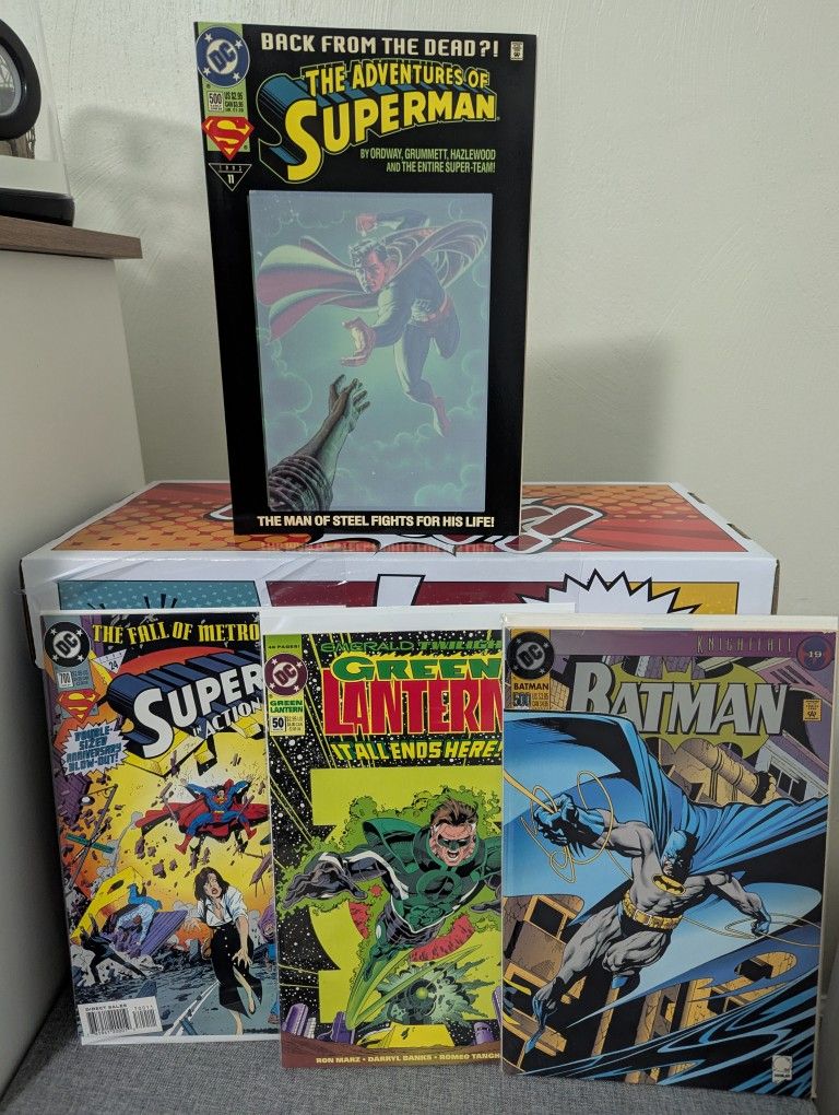 DC Comics Lot. Batman #500 (Knightfall), Superman in Action Comics #700, Green Lantern #50, Adventures of Superman #500 Collectors edition.
