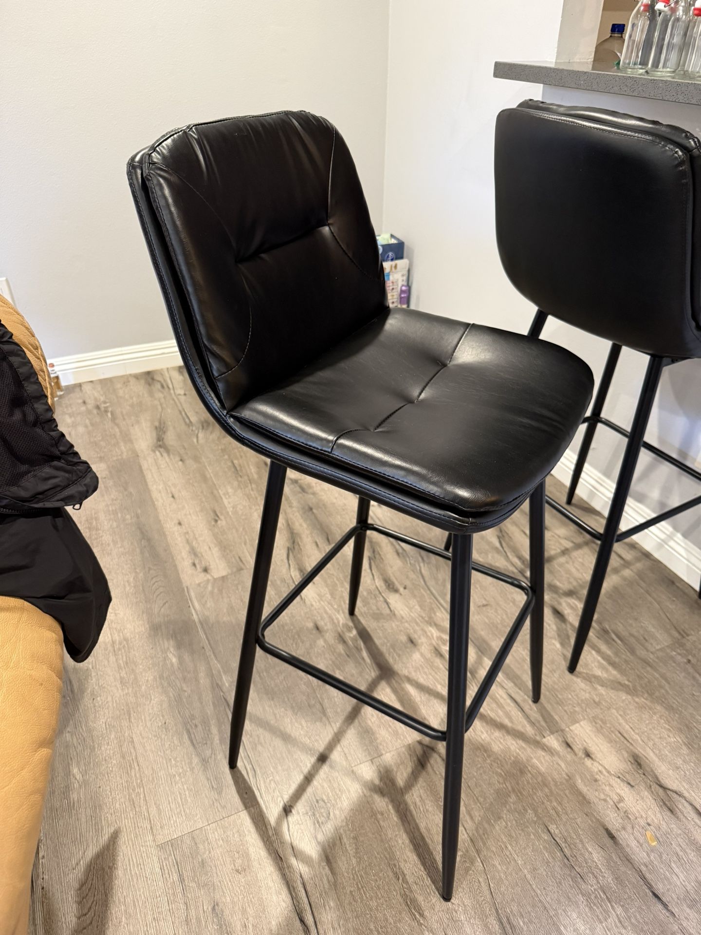 2 black, fake leather/leather-like material barstools with back. Just moved to a new place that doesn’t have a place to put these chairs. Barely used them at my old place. Below are dimensions for your reference. Seat 17x17 inches Seat is 30 inches off the ground Top of the back of the chair is 42 inches off the ground