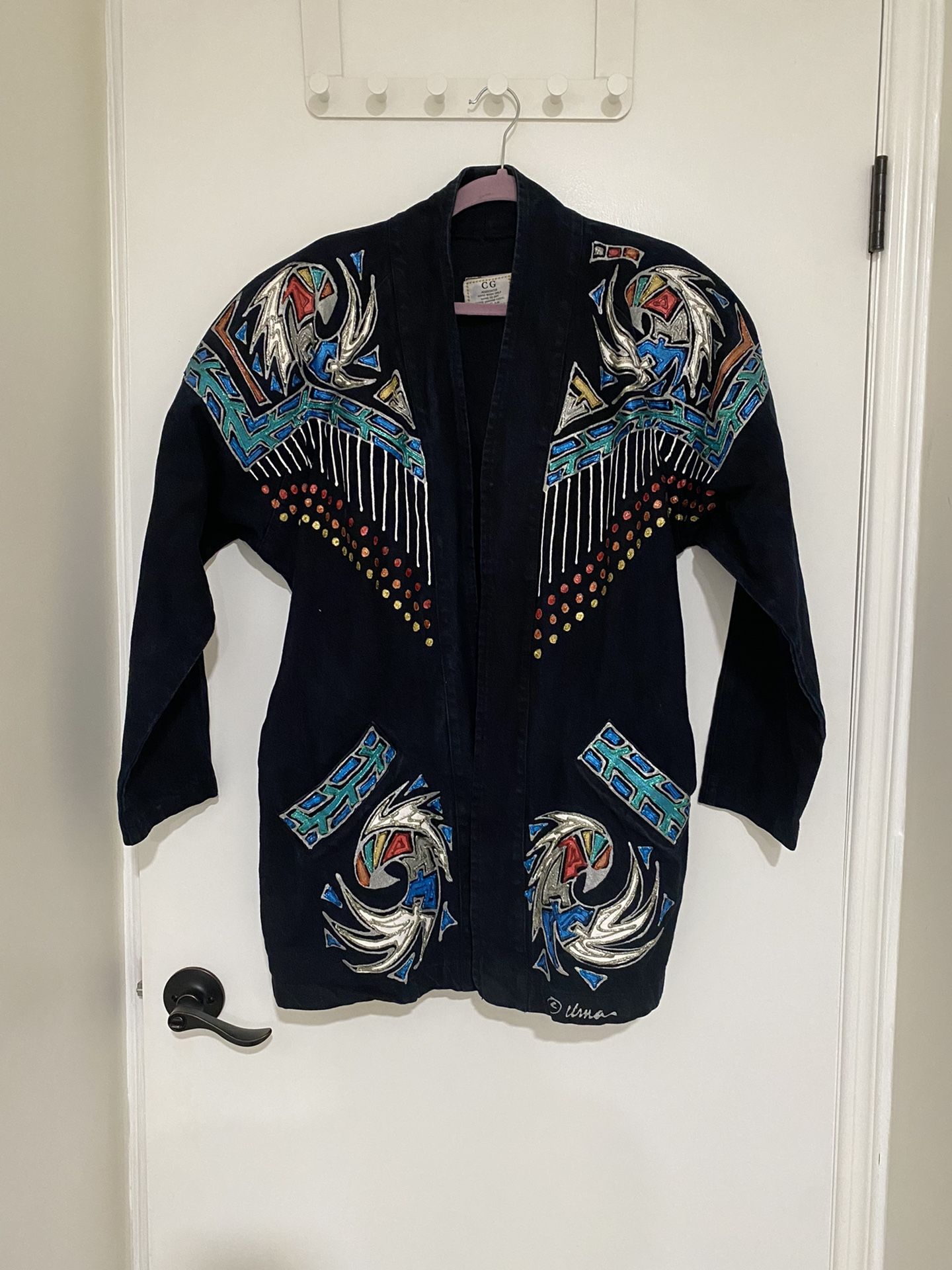 The best Sundance Hand Painted Denim Jacket !!!! Very good used condition with slight fading on denim (not of the actual painting design) Size S Long dark wash denim jacket 100% cotton It is hand painted by Uma Designs (one of a kind) Over sized fit Ship within 1 business day !! Please don’t forget to follow me and check out all my other items. I have many items to post and will be trying to add daily. Bundle items to save with shipping ! Thank you!