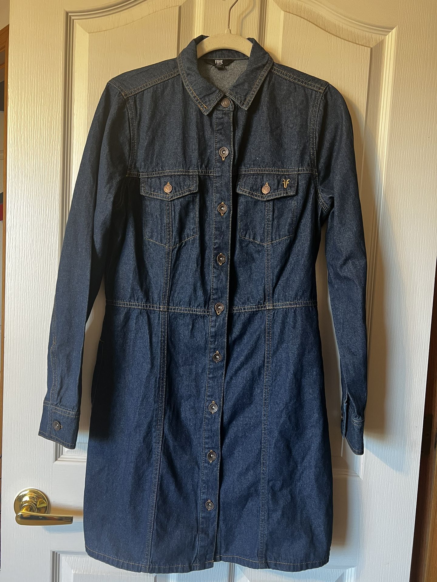 Frye Women’s Blue Denim Dress. Button up Front Pockets. Long Sleeves.