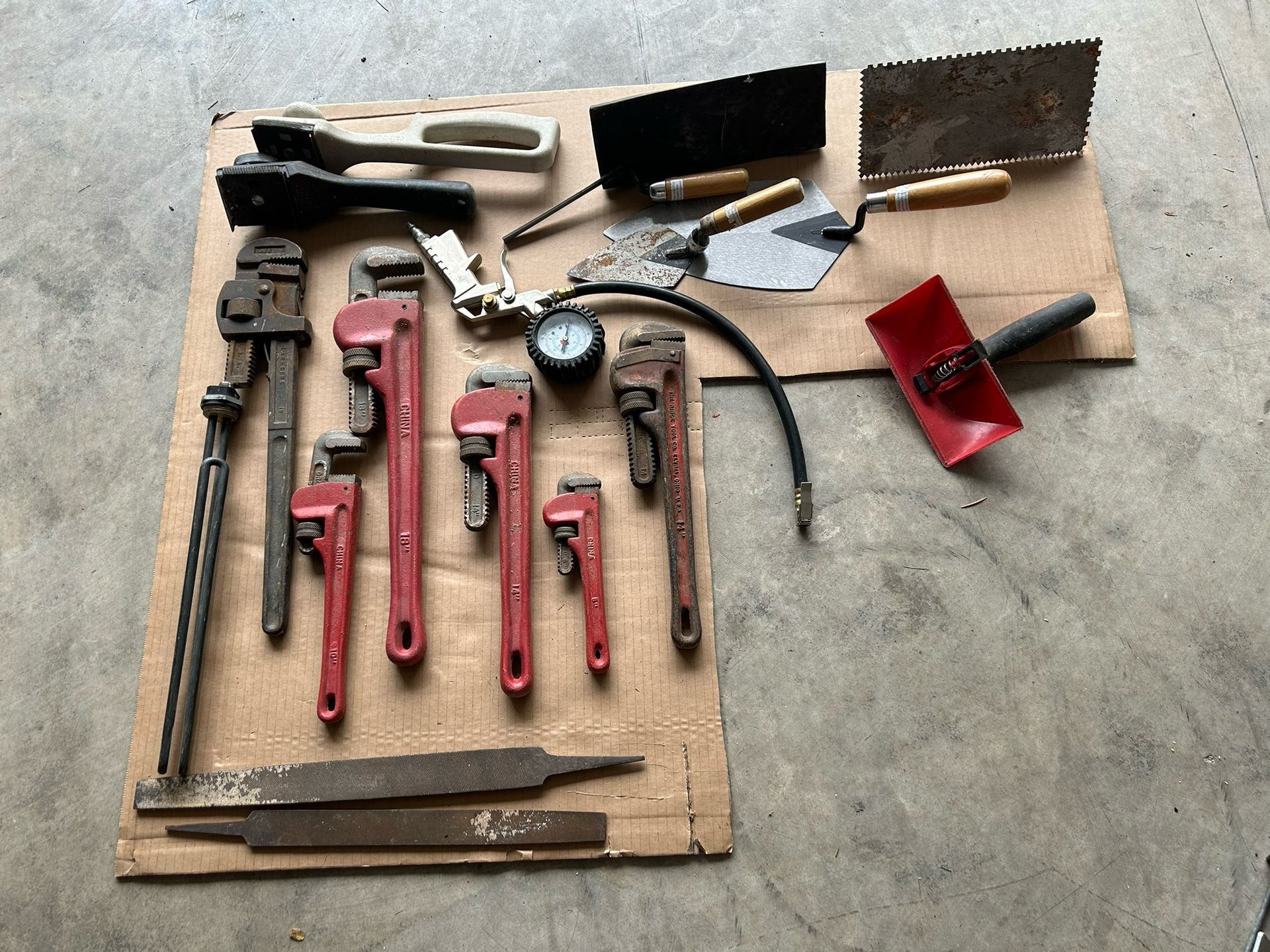Bucket of various tools I have purchased through the years and have never used, or no longer have a use for. Some are Home Depot, others are Harbor Freight and some are from Garage sales. Over 50% discount on all items (some even greater). The following items are included (descriptions are approximate): 2x 18" Files; Water Heater Element; 18" Vintage Lakeside Pipe Wrench; 14" Vintage Ridge Tool (Rigid) Pipe Wrench; 18" Harbor Freight Pipe Wrench; 14" Harbor Freight Pipe Wrench; 10" Harbor Freight Pipe Wrench; 8" Harbor Freight Pipe Wrench; 14" Paint Scraper; 12" Paint Scraper; Tire Inflator for Compressor; 6" Masonry Trowel; 12" Masonry Trowel; 6" Pointing Trowel; Serrated Tiling Float; Rubber Grouting Float; Paint application pad; Tool Bucket. Total value over $190. Selling as a single unit, cash only. $90. You collect. Comes with the bucket!