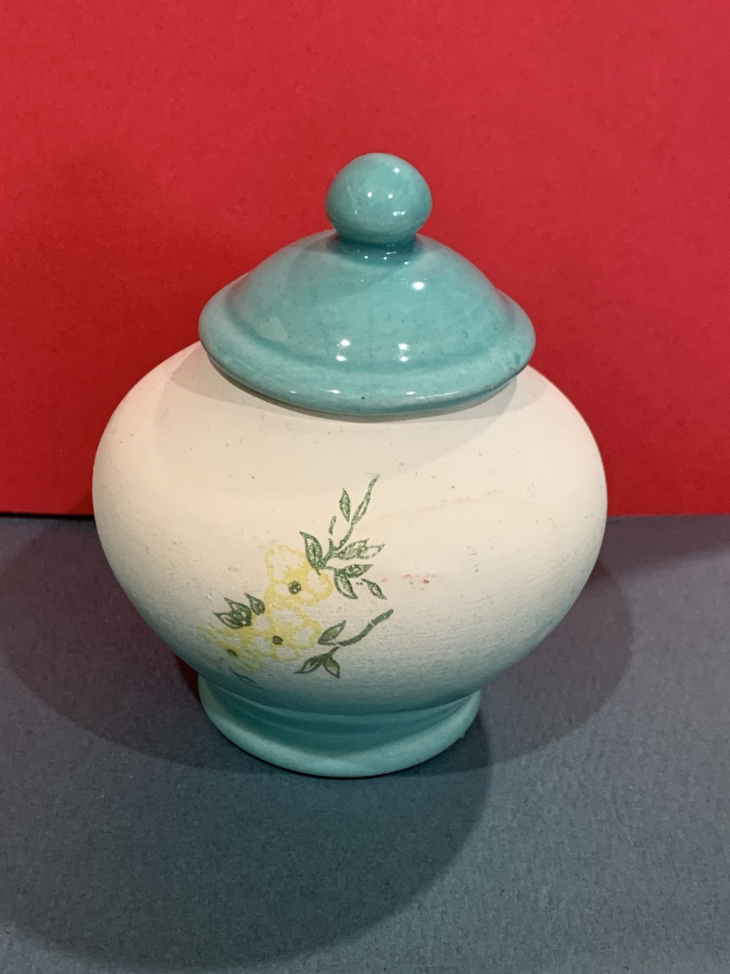 Small pottery jar, white with sage green and yellow floral design. Measures 3.5” high by 3” wide.