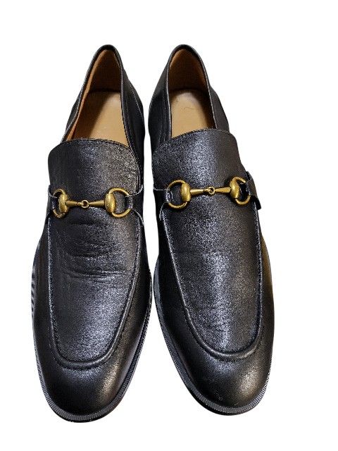 Sophisticated black leather loafers featuring elegant gold detailing. Ideal for a polished, stylish look.