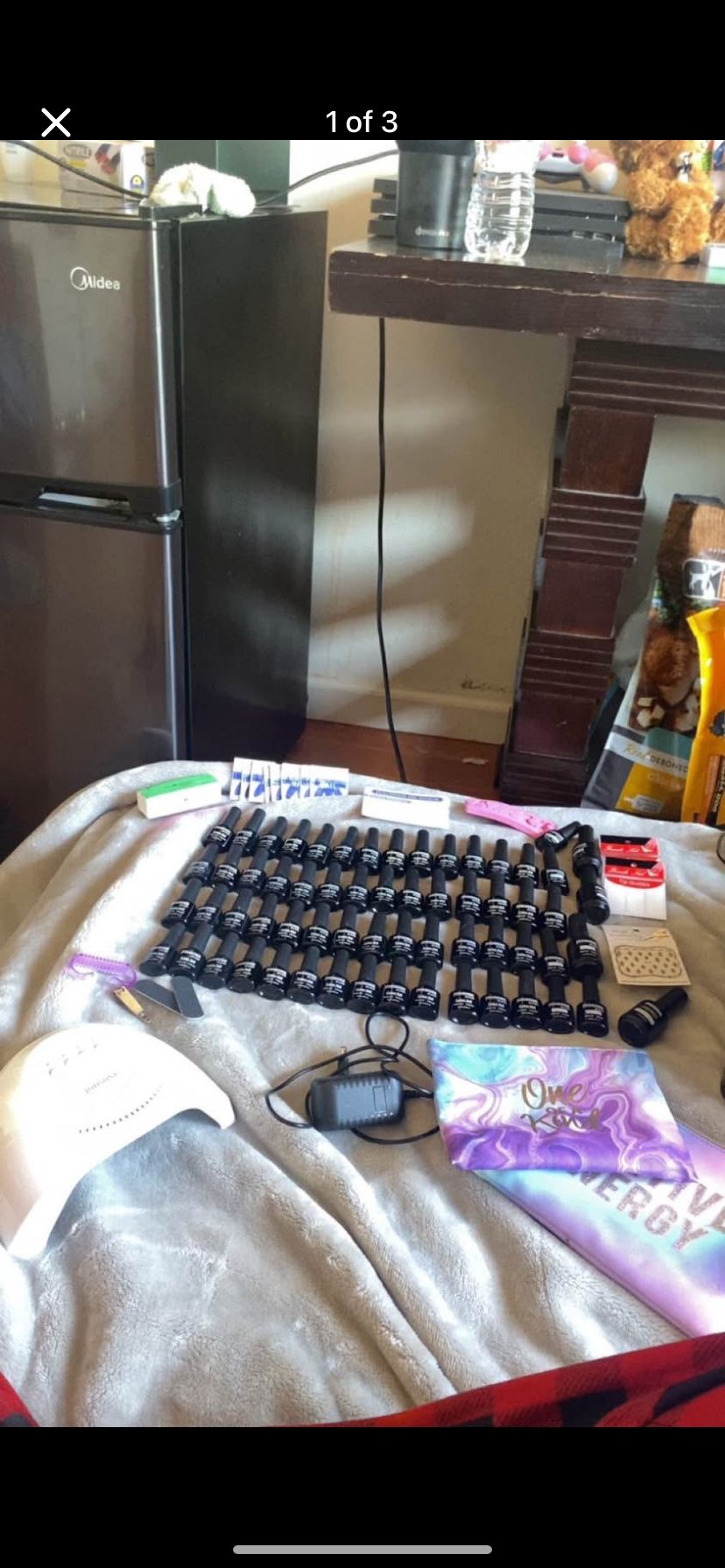 Only used 1 time Comes with 50 nail colors 5 base/top coat polish 1 matte top coat The bag it comes in is a little dirty from the nail polish. All fills and tools were never used Only thing was used was a nail polish with the LED light The used nail polish is not included due to it being used