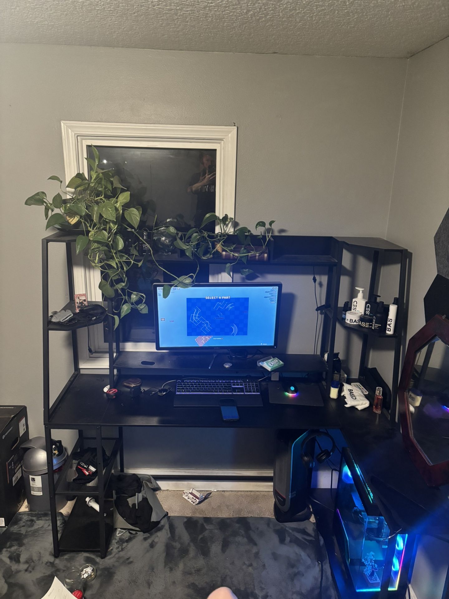 Great black desk with shelves hutch, upper and lower shelves. In great condition, had it for a couple years in my son’s room. He’s just ready for something different. Originally 200 dollars. 5 feet 3 inches wide. 4 feet 4 inches tall with the shelves. 20 inches deep. 43 inches wide on the L shape part.