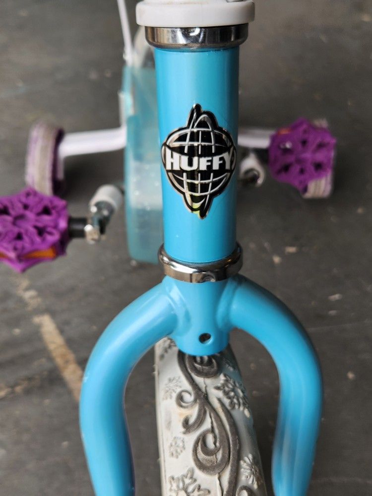 Selling USED Huffy frozen kids' bike. Normal wear. Tires are good still hold air. Has training wheels and a basket to put a toy. Asking 15.00