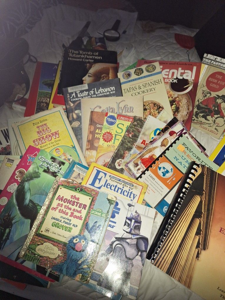 Lots of books from history to funny little books 12 different cookbooks a good variety must take all as one unit