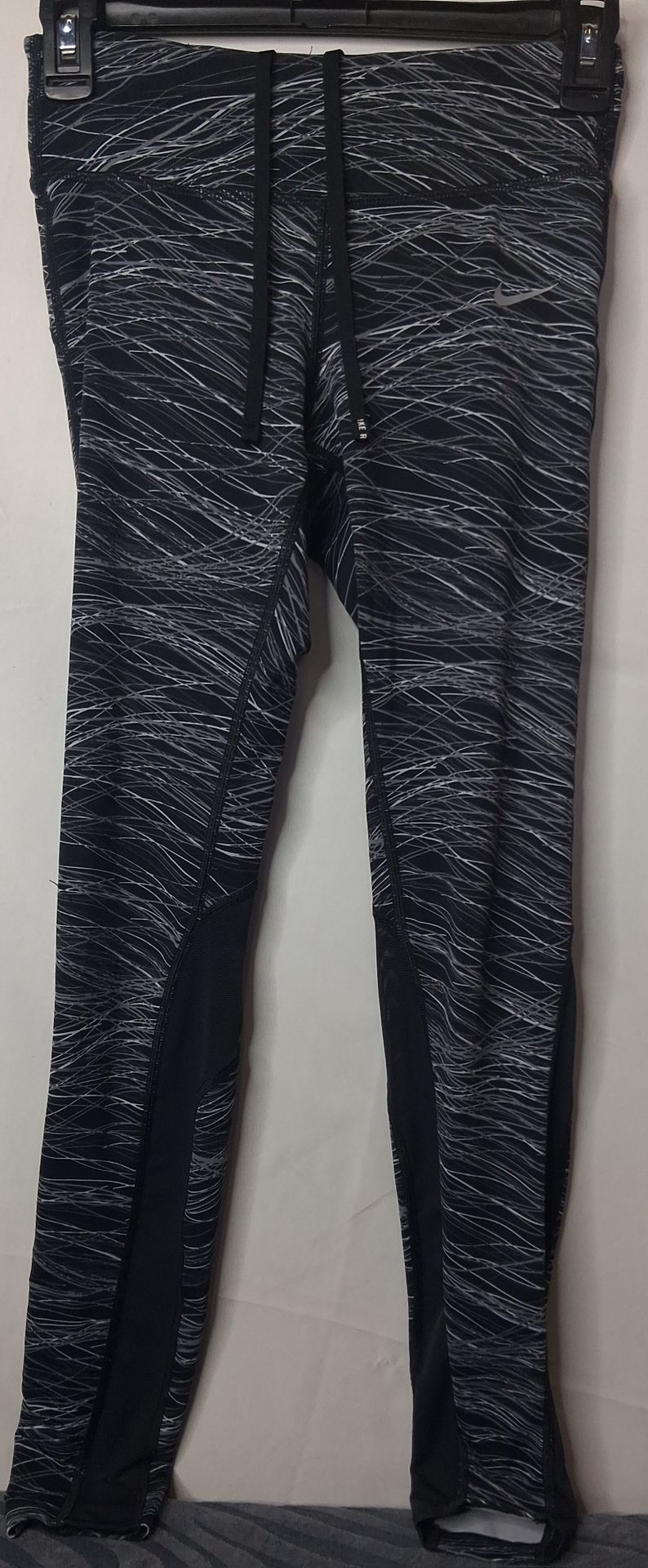 Athletic Nike Dri-Fit leggings. XS size. Has a cool black and white patterned design. Features a drawstring waist and a small zippered pocket on the back. Made with nylon and spandex for comfy stretch. Sku#C0051