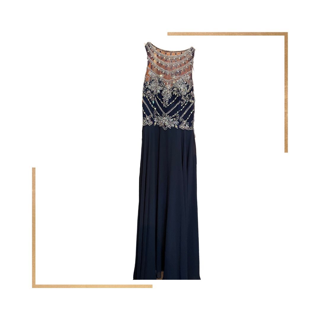 Color: Navy sheer back full length dress