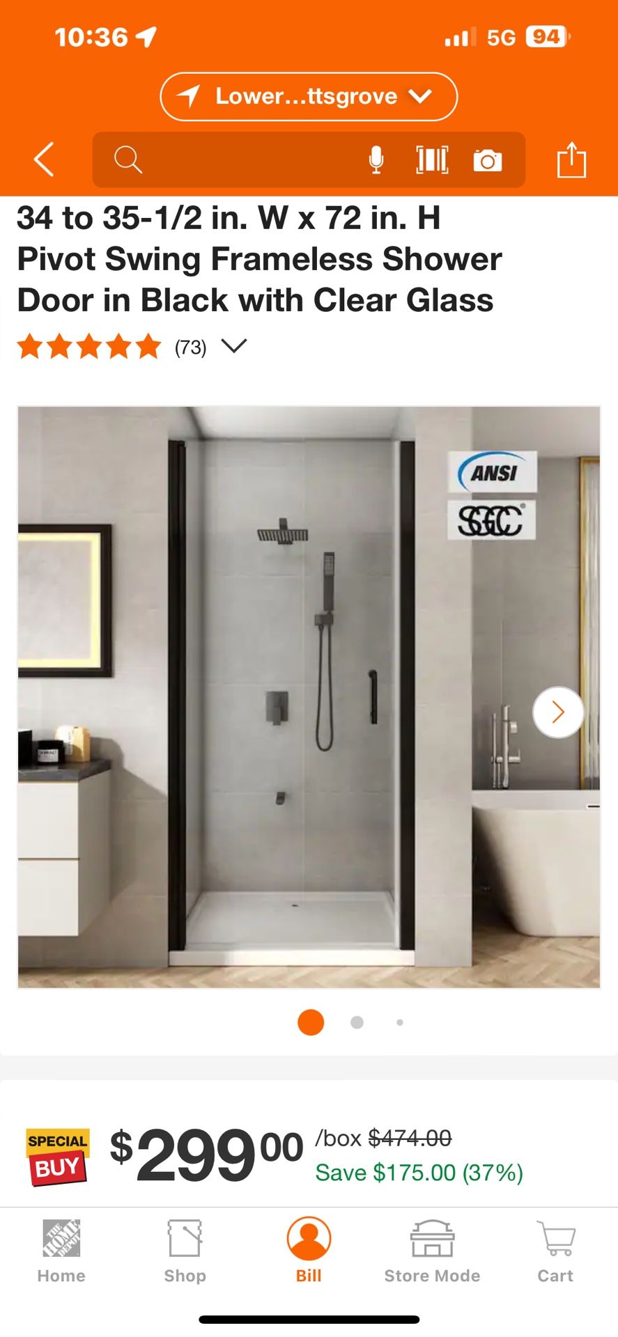 Black shower door. Brand new in box from Home Depot. Check out part number online and see if it fits. Delivered to me by mistake.