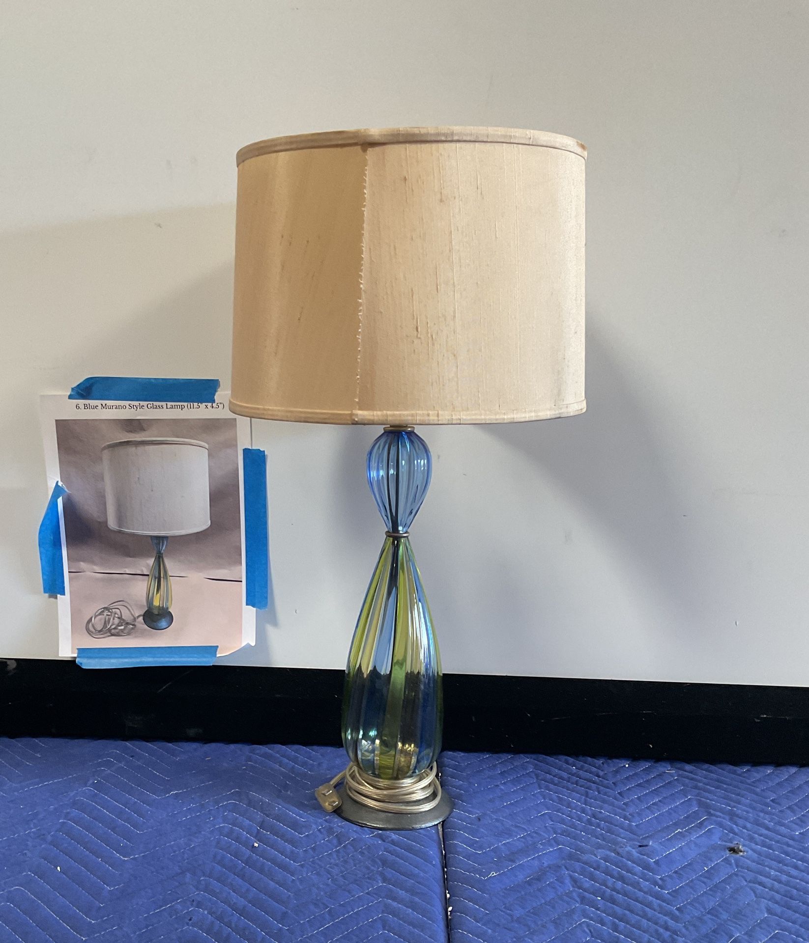 Murano Style Blue Swirl Glass Lamp Lamp Dimensions Height: 11.5 inches Width: 4.5 inches Lamp shade Dimensions Width at the bottom: 12 inches Width at the top: 11 inches Shade height: 8 inches