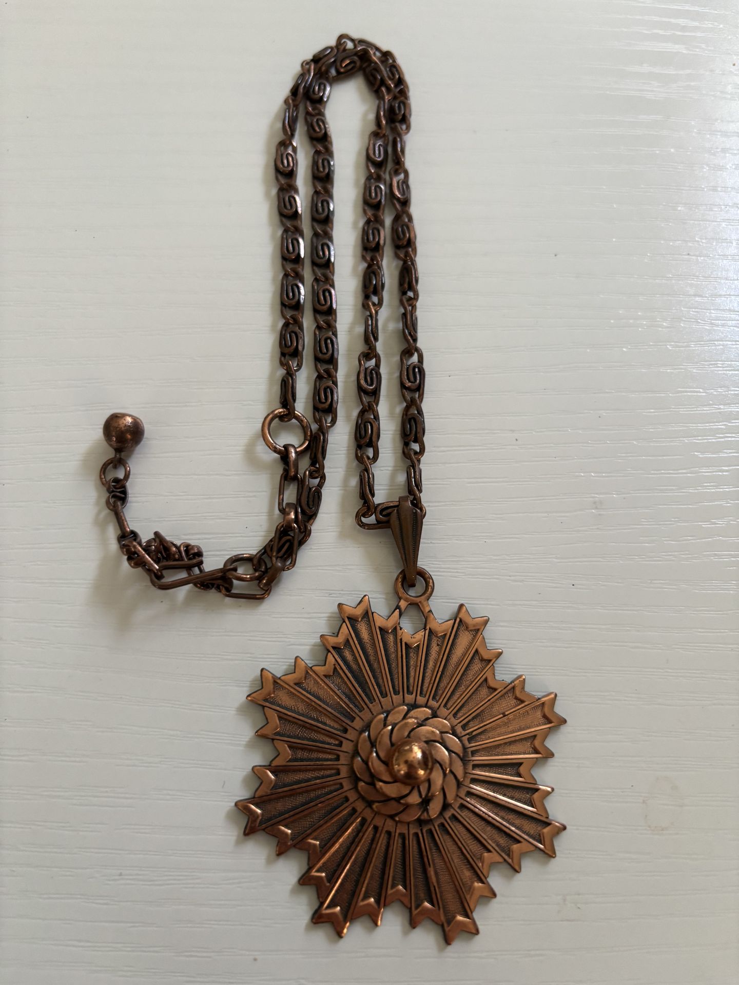 Vintage starburst pendant necklace. The chain measures approximately 20 inches. Made in the 50s or 60s from genuine copper.