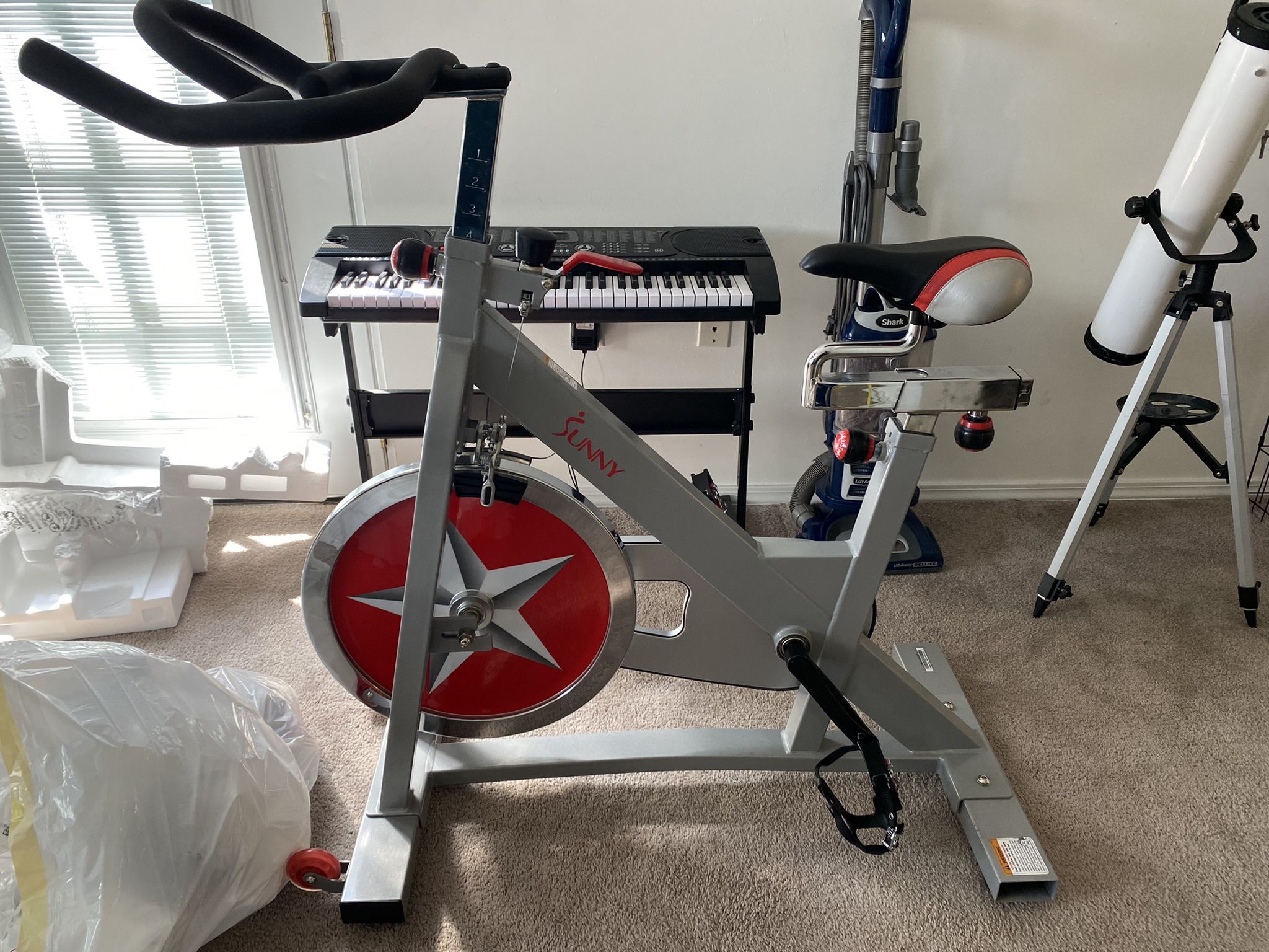 Great indoor exercise bike from Sunny. This this is a good solid bike. I have used with the Peloton app and cadence meter and it worked great, just decided to upgrade. Second picture is the Amazon ad so look it up to get all the info on the bike :)