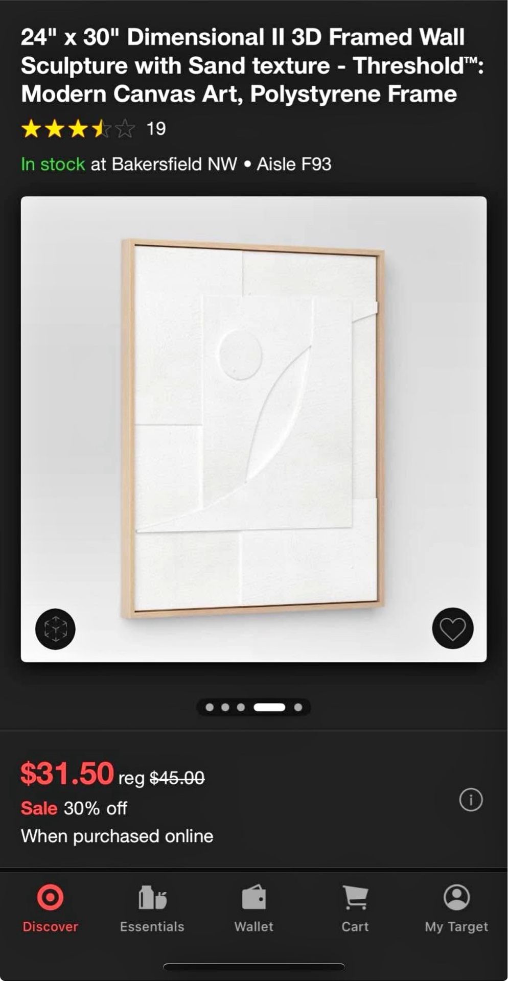 Pick up in Bakersfield CA Original is $45 and currently on sale so 31. But I’m selling it for $15. Delivery is also available $10 in Local Bakersfield Dimensional II 3D framed wall sculpture delivers modern and artistic vibes • Textured abstract design adds depth and a sensory element to the piece • Encased in a frame to seamlessly complement your decor • Versatile design for both vertical and horizontal orientation