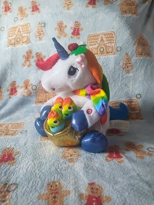 Rainbow Christmas unicorn that sings "Deck the Halls". For any age. Batteries are included. Any questions, feel free to ask!