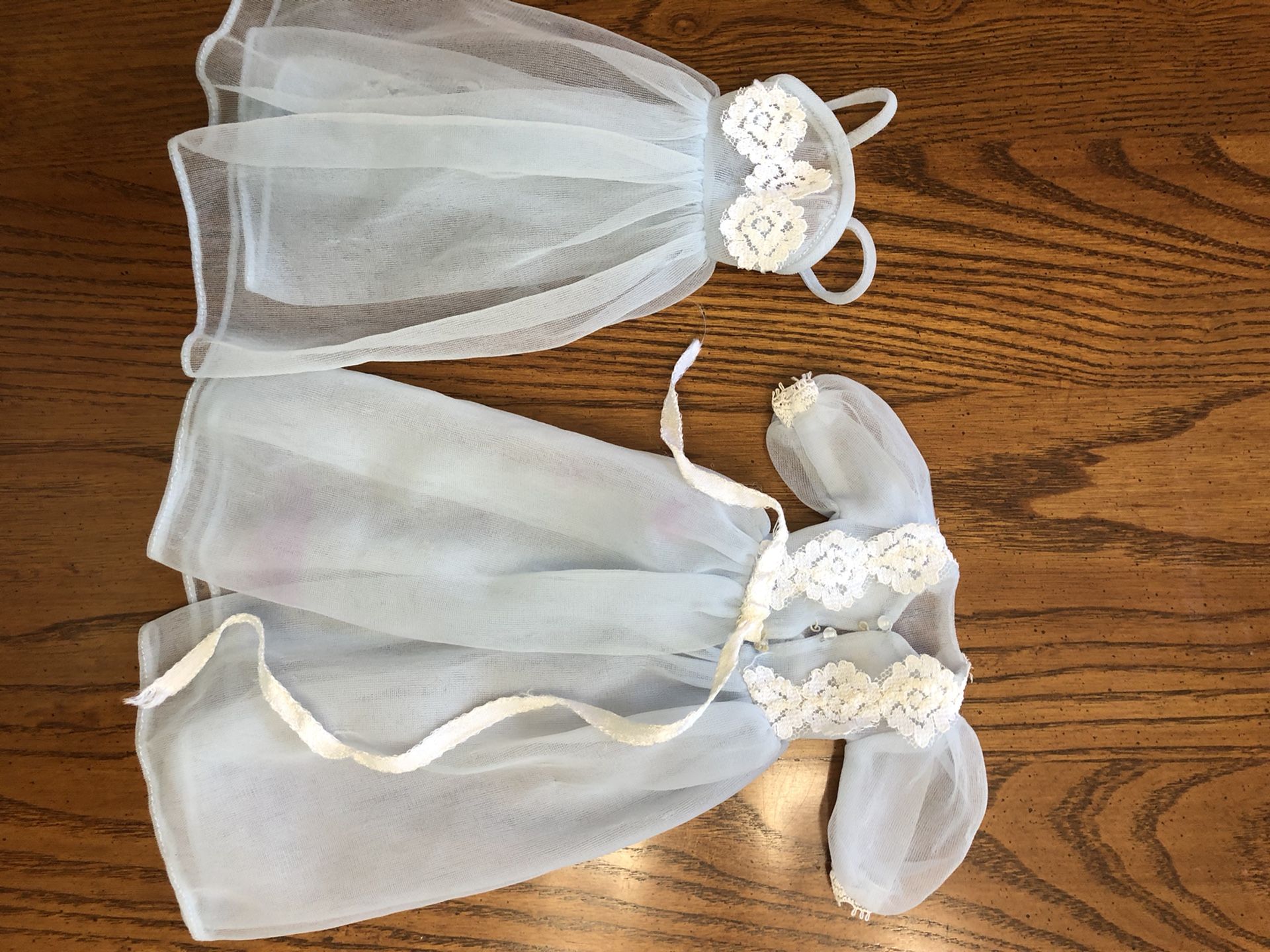 Light blue gown and robe. All little ball buttons on both pieces are in tact. Loops are also there, though some a little stretched out. One ribbon tie on the robe is short. Two spots of light pink discoloration on robe (see picture) - may be able to get them out. I have not tried. There are two layers of blue sheet on the gown. There are a couple small (moth?) holes in the outer layer (see pictures)