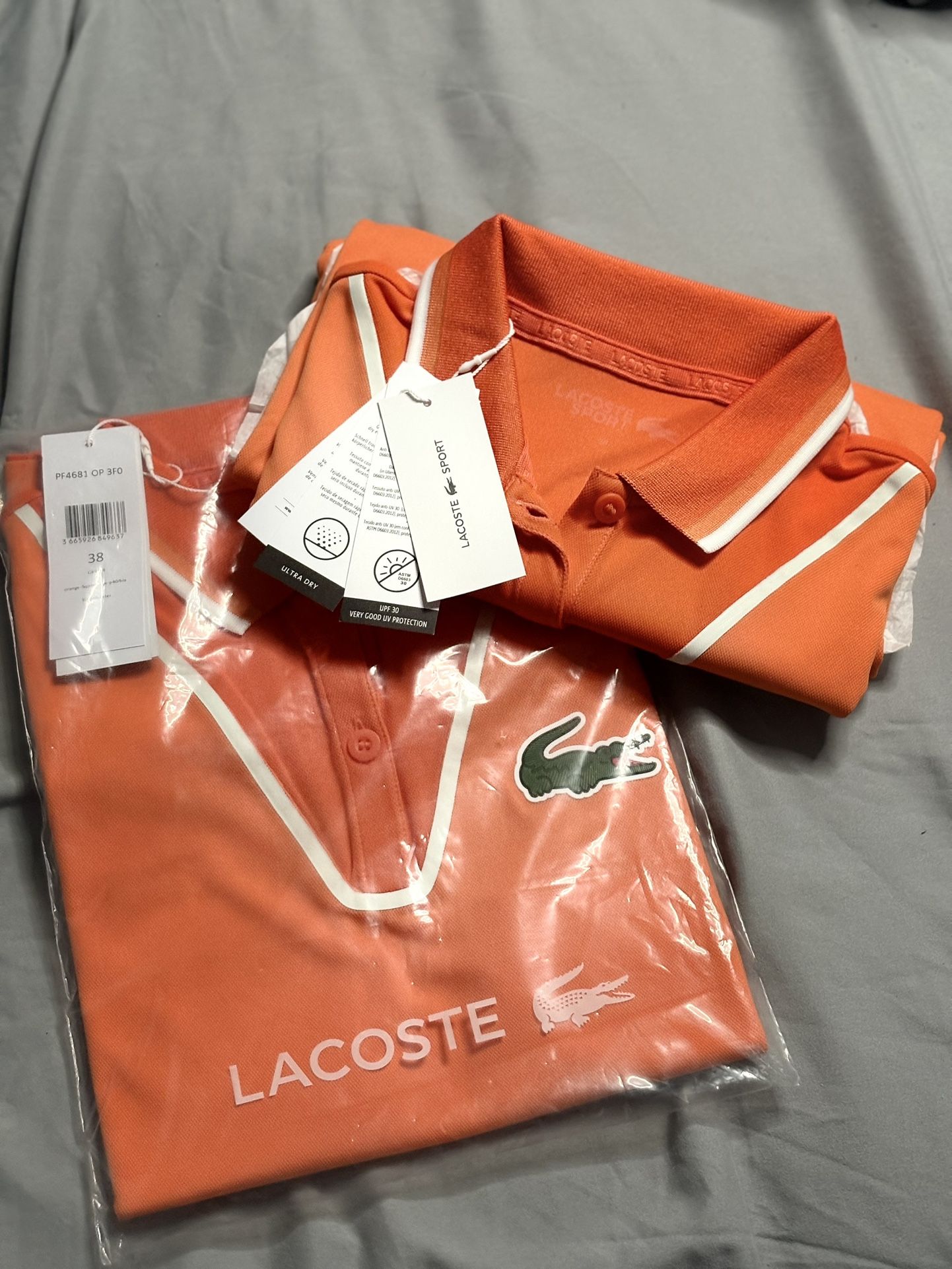 Set of 2 brand-new Lacoste Women’s Miami Open Ultra Dry Polos 🐊 Official Lacoste Sport LIMITED edition, vibrant orange color, never worn and still sealed in original packaging. Regular fit with Ultra Dry performance fabric — lightweight, breathable, and perfect for tennis, workouts, or casual wear. ✨ Size: 38 ✨ Retail: $120 each 💼 Selling both for $160 (or best offer) Pickup in Boca Raton