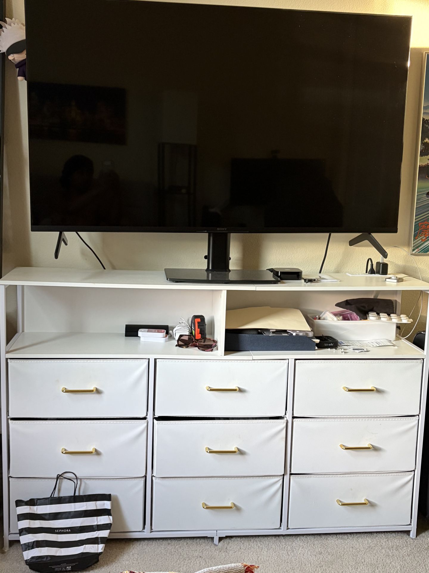 Versatile white storage dresser. Has a sturdy frame with 9 fabric drawers, each with a cool gold handle. Two open shelves on top for extra storage or display. Built-in power strip on one shelf with two regular outlets and two USB ports, super handy for charging electronics. Great as a media console or for bedroom storage.