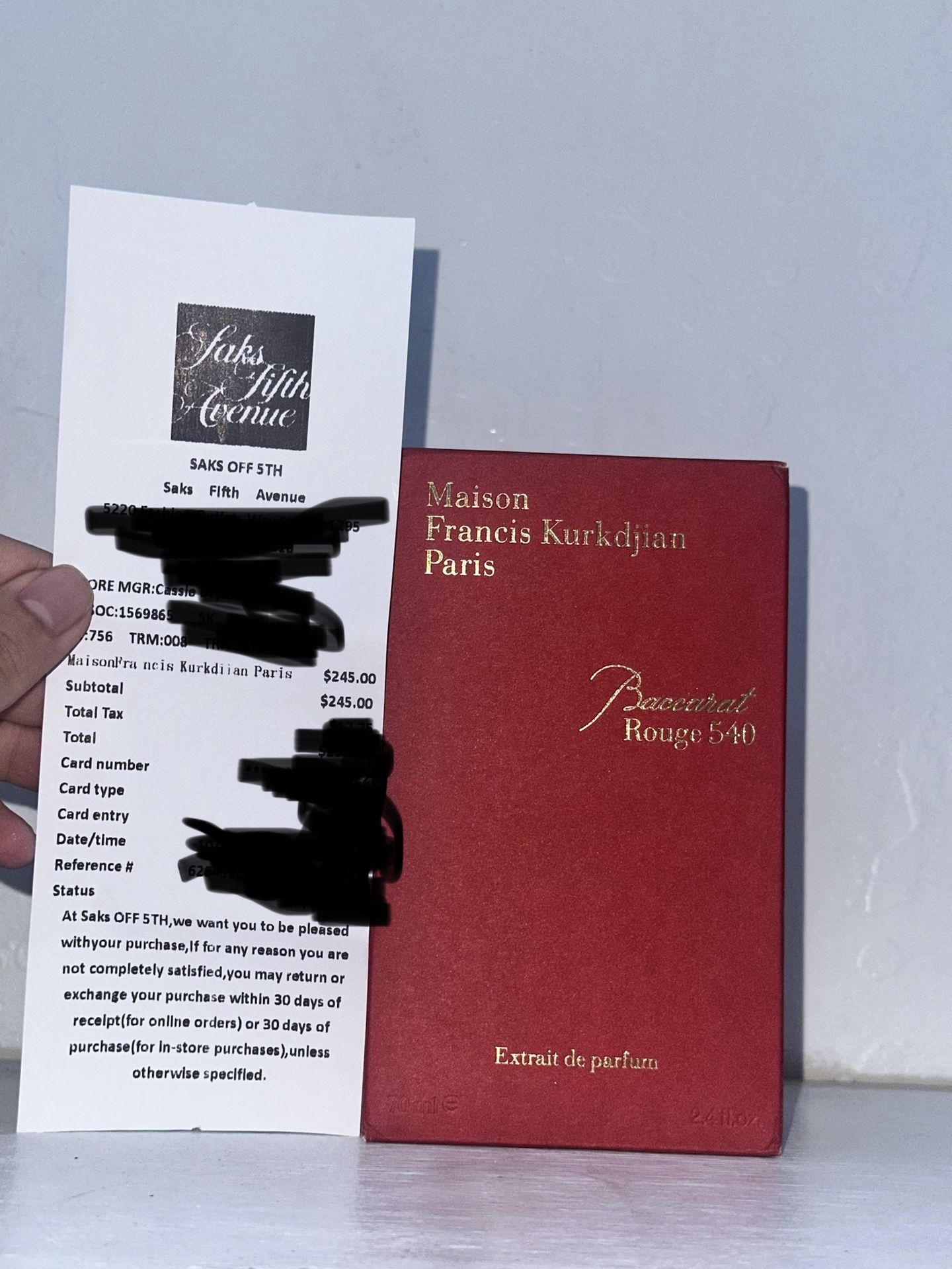 Authentic Maison Francis Kurkdjian Baccarat Rouge 540 Extrait de Parfum (70ml / 2.4 fl oz) bought from Saks OFF 5TH. • 100% genuine, includes original box and receipt • Never sprayed or used • Stored safely since purchase • Great deal for a luxury scent that retails for $245+