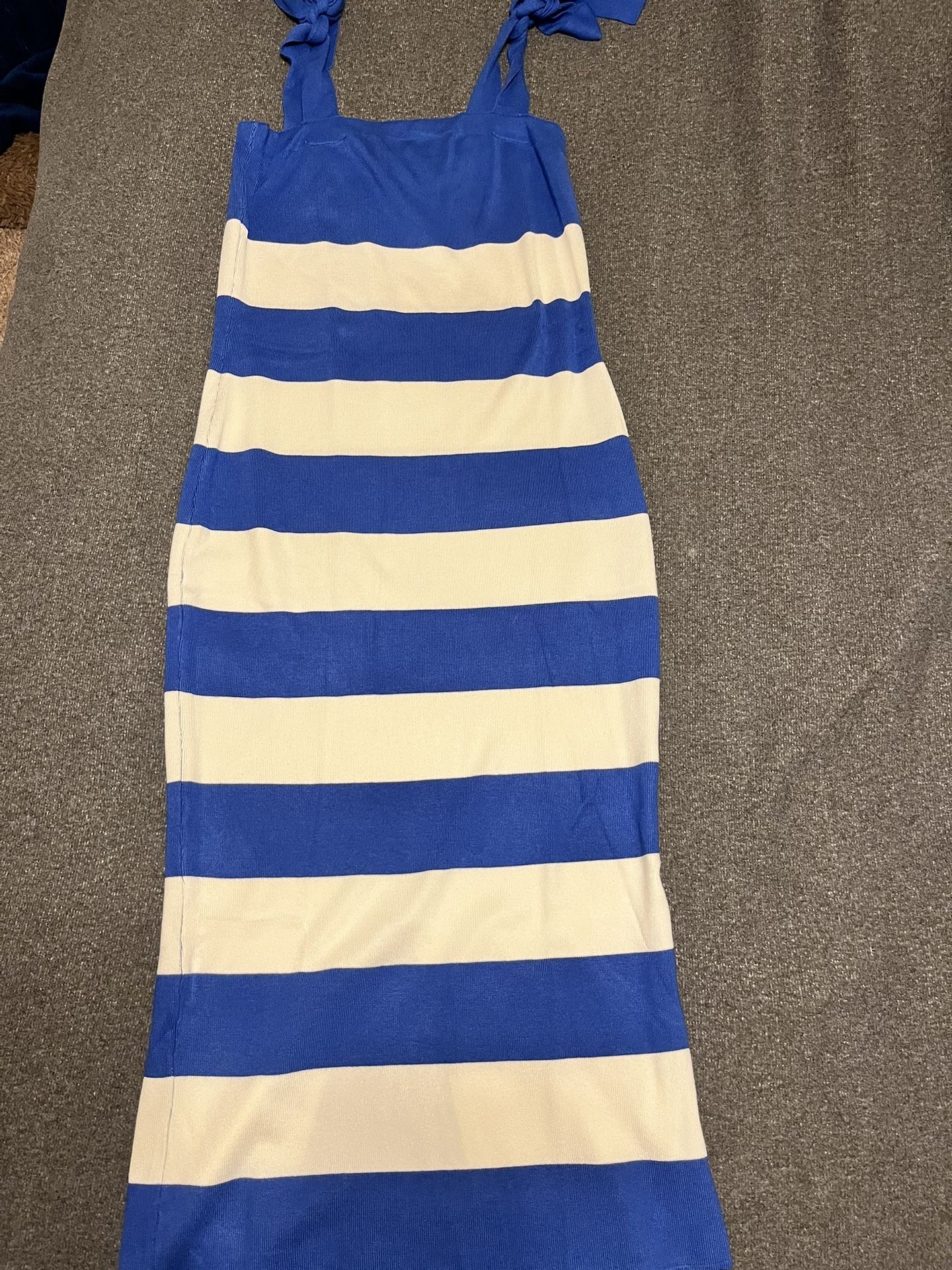 Blue striped dress, spilt on back side near bottom of the dress, tie sleeves