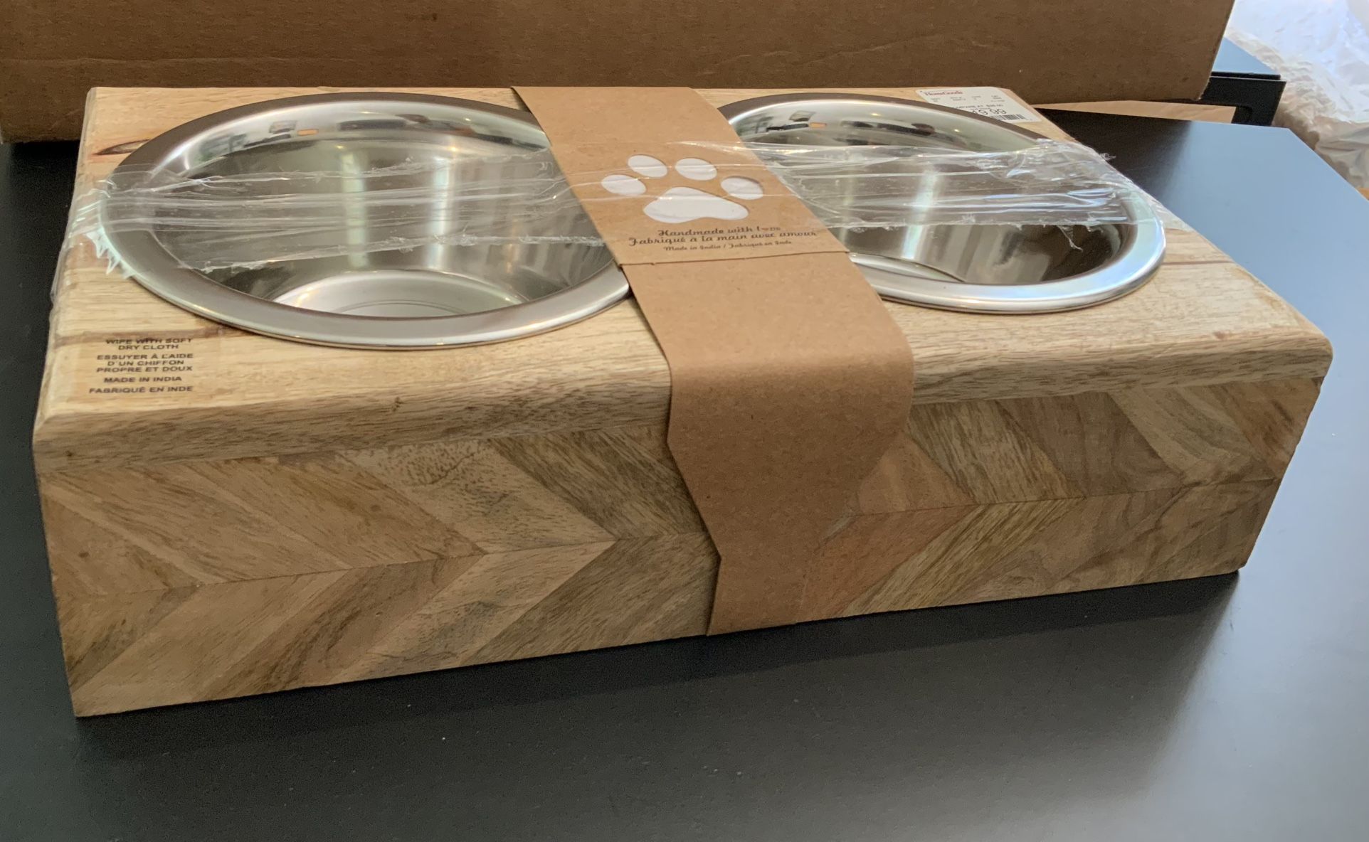Hand made wood & stainless steel pet bowl. Bowl capacity: 1 Qtz