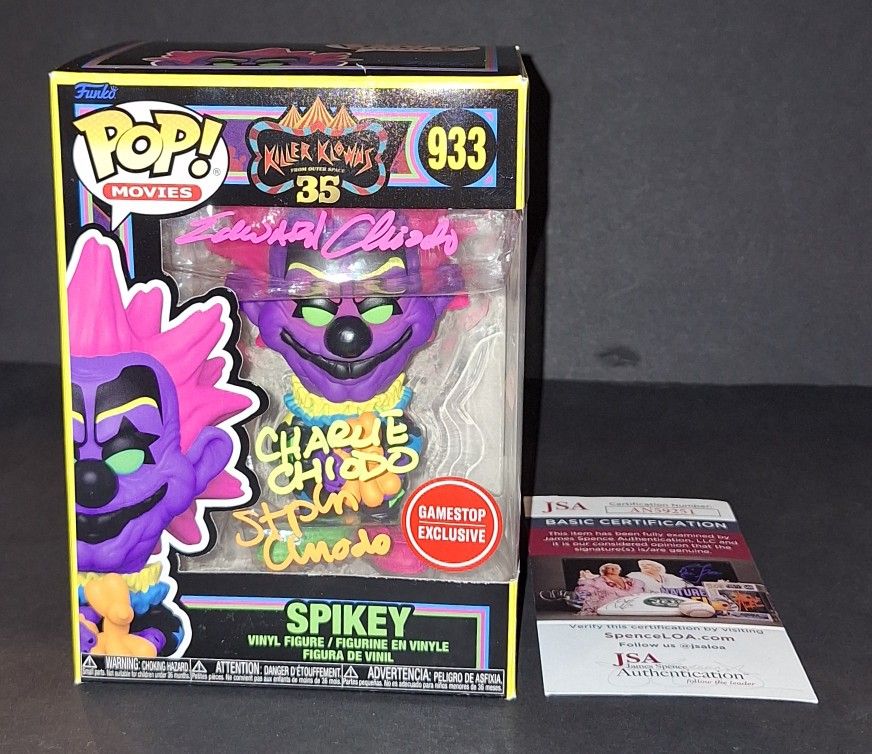 Signed by directors Charles Chiodo, Stephen Chiodo, and Edward Chiodo on a Spikey Killer Klownz from Outer Space Gamestop Exclusive blacklight Funko. JSA authenticated. Will come with the hologram and matching card. Will come in a pop protector. There is a small imperfection please see the last photo. Please see my other items. Will ship secure within one business day. Please message with any questions thank you! Memorabilia