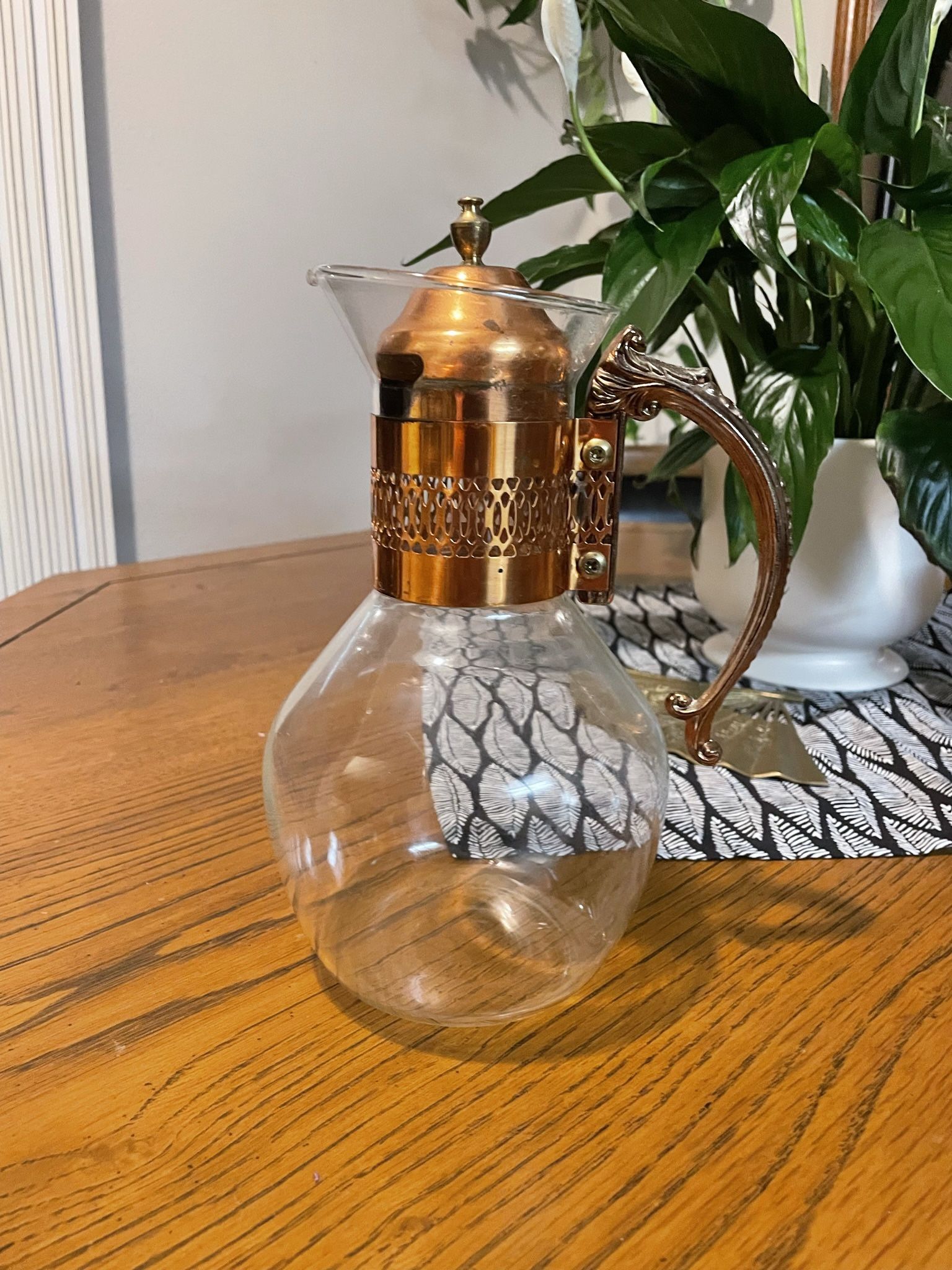 Beautiful, vintage coffee carafe with bright copper. Please note little crack on the spout. The glass edge is not exposed so doesn’t affect function.