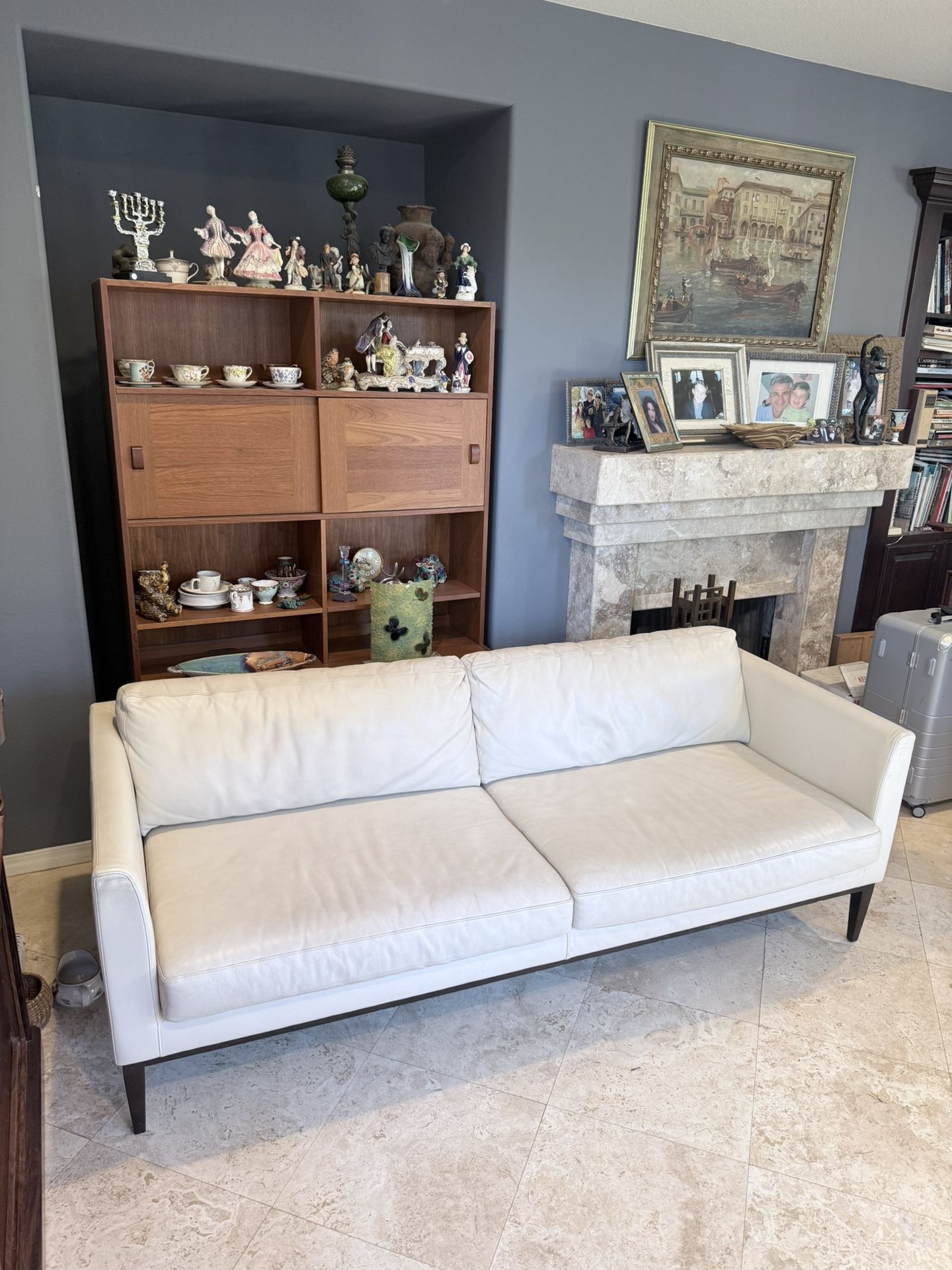 Beautiful Off White leather couch with Brown dark brown leg finish Made by American Leather in the USA MCM Inspired $4000 in store 83in long, 35in deep, 28in floor to arms