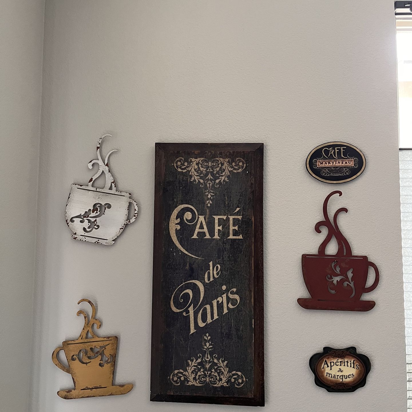 Metal coffee cups - lightweight Ceramic plaques - appetizer & cafe Wood panel - Cafe de Paris Clean pet free / smoke free home $24 Cash SW area