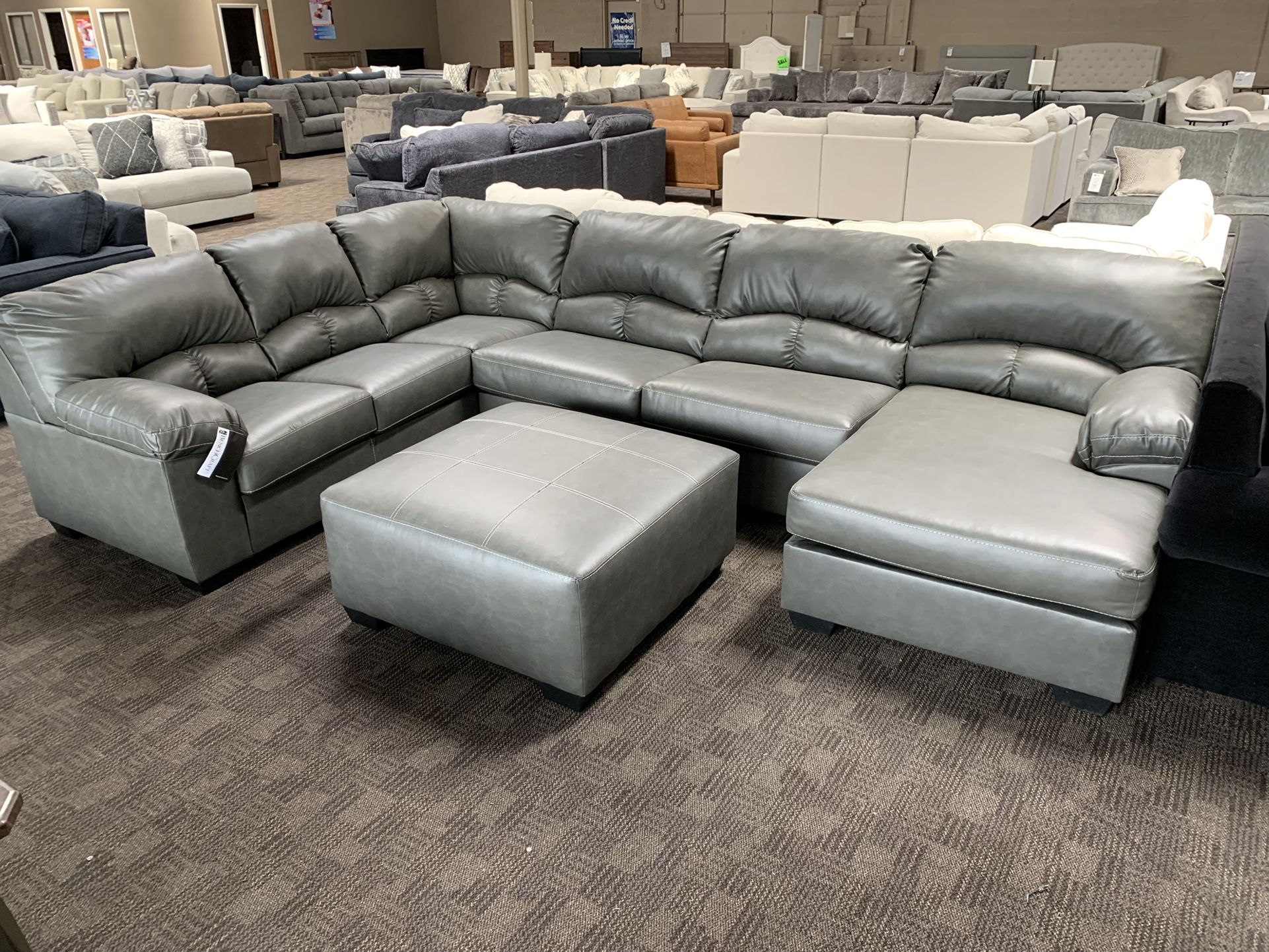 Brand new Grey sectional! Attached cushions. High-resiliency foam cushions. Overstuffed pillow top armrests. Measures 94” by 141” by 61” Delivery and payment plans available