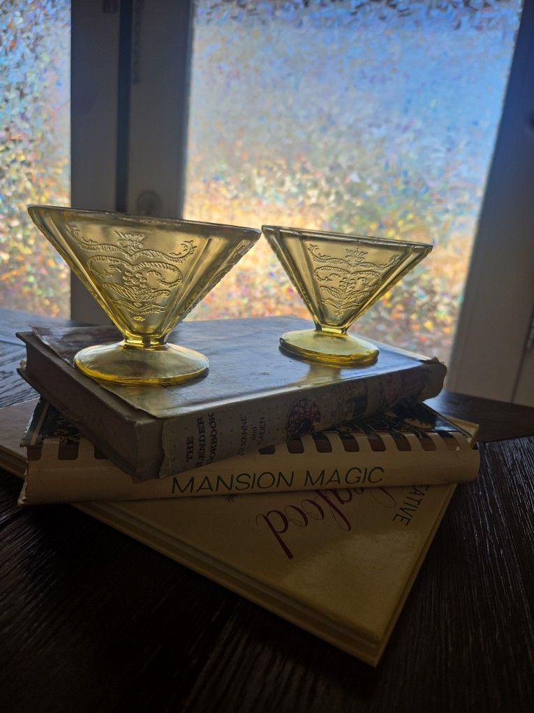 Set of 2 vintage yellow pressed glass sherbet cups. Raised embossed design you can feel. 2.75” tall 4” diameter Approx. 0.375 lb each Perfect for desserts, ice cream, fruit, or cocktails.