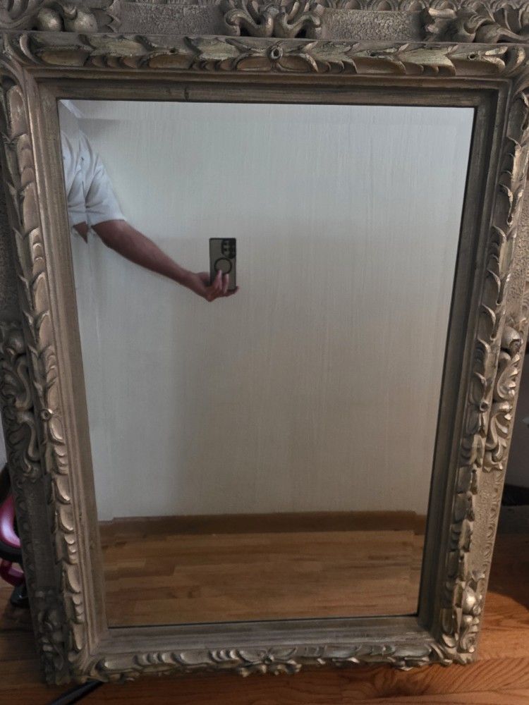 Mirror - Ornately Framed Beautiful, ornately framed mirror measuring approx 36" x 48". Faux antique silver/aged finish. Great for home or office. Excellent condition. Heavy- 30-40 lbs? (Heavy duty mounting hanger required) $150