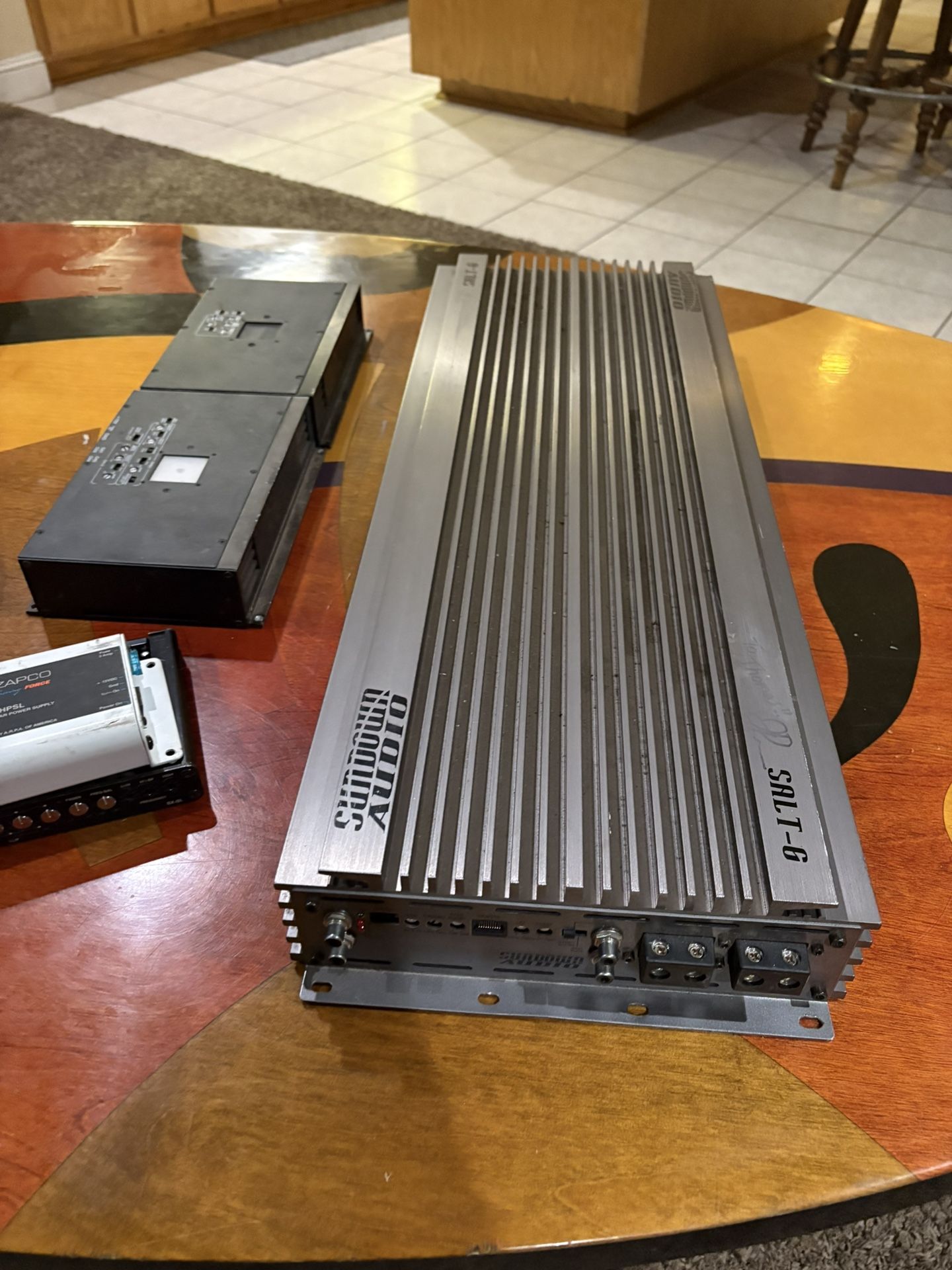 The sundown audio salt six does 8000 W and low-voltage on the Dino test salt stands for sundown audio low-voltage technology so you don’t need a ton of voltage to keep the power rating up very nice Amp signed by Justin Price down for sounds owner. The amp retails at $1900 plus shipping. It’s around 2100$it’s up for sale for 1200 firm