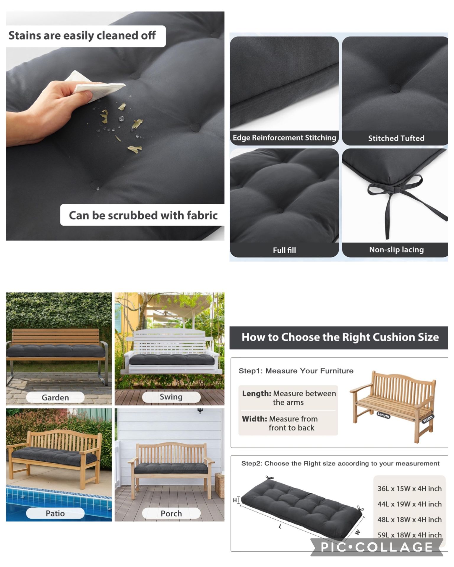 4" Thick Outdoor Bench Cushion 36x15x4 Inch, Waterproof Patio Furniture Cushions, Bench Seat Cushion 4-Inch Thick Support: Filled with 4-inch high-resilience shredded foam, this outdoor bench cushion provides firm, lasting support without flattening—even after extended use. Designed to keep its shape and comfort over time. • Dual-Layer Waterproof Protection: Crafted with a water-resistant outer coating to repel rain and spills, plus an inner TPU waterproof layer that prevents moisture from penetrating the cushion, ensuring long-lasting durability in outdoor conditions. • Up to 3 Years of Fade Resistance: Made from 300gsm high-density polyester fabric, this bench cushion features advanced color-lock technology to resist fading for up to three years, even with regular outdoor exposure. • Size Information: Includes one bench cushion measuring 36” L x 15” W. Please measure your bench seat carefully before purchasing to ensure a proper fit. • Easy to Clean & Maintain: Simply spot clean with mild soap and water, then air dry. The cushion quickly regains its original shape after unpacking—allow up to 48 hours for full expansion.