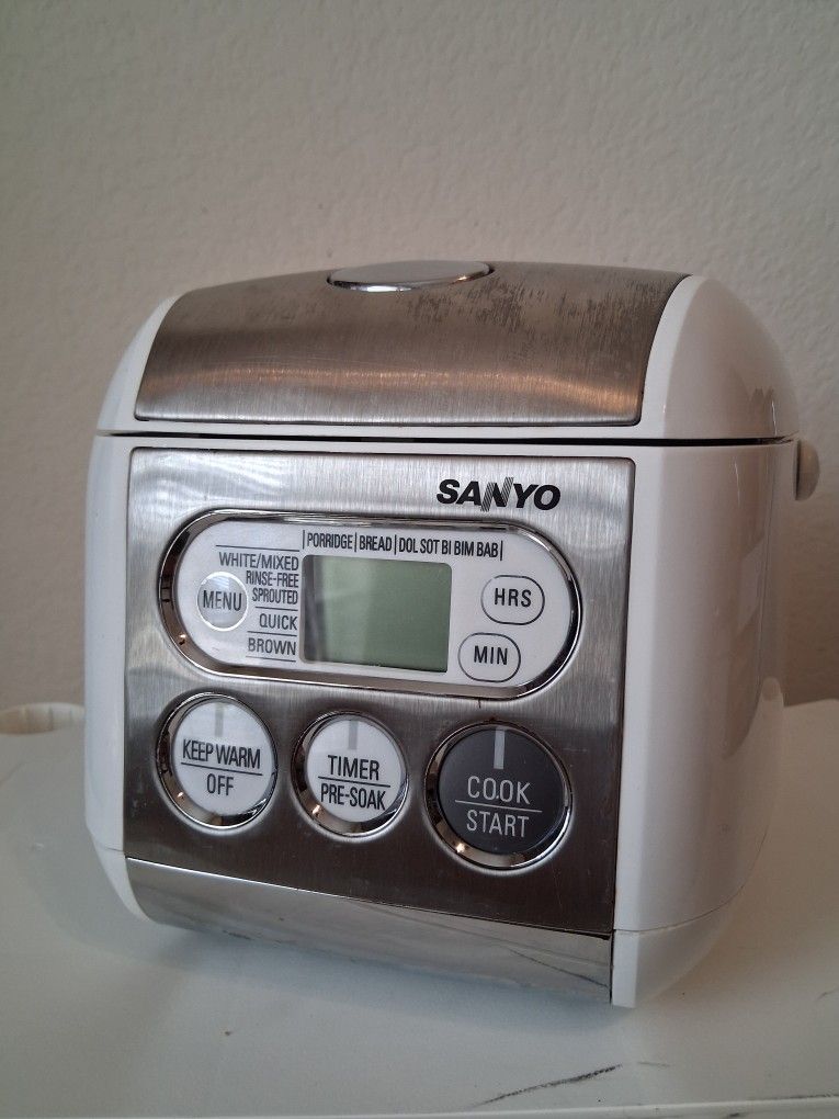 Sanyo programmable rice cooker. 3.5 raw rice capacity. Multicooker. Small scratch on inner pot. Still great. Cash only. $20. Firm price. Good deal for you. Pick up in Jarrell.