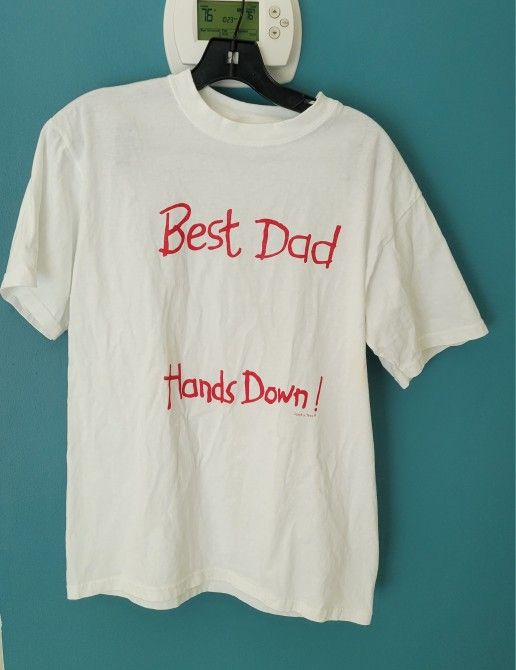 This is a cute HANDY TEES (ANVIL) short-sleeved white t-shirt with “Best Day Hands Down” across the front. Made for putting your child’s hand imprints in paint on the shirt. It is made of 100% Cotton (pre-shrunk). Please note there is a small yellow-ish blemish on the front, where the handprint would go, so it doesn’t affect the shirt at all (see last photo). I have discounted it to accommodate. SIZE M Measurements (approximate) laying flat: Chest: 19 ½ " (from under arm to under arm) Shoulder seam to seam: 19” Length (shoulder to hem): 27” Machine Wash Warm. From a non-smoking, pet-free home.