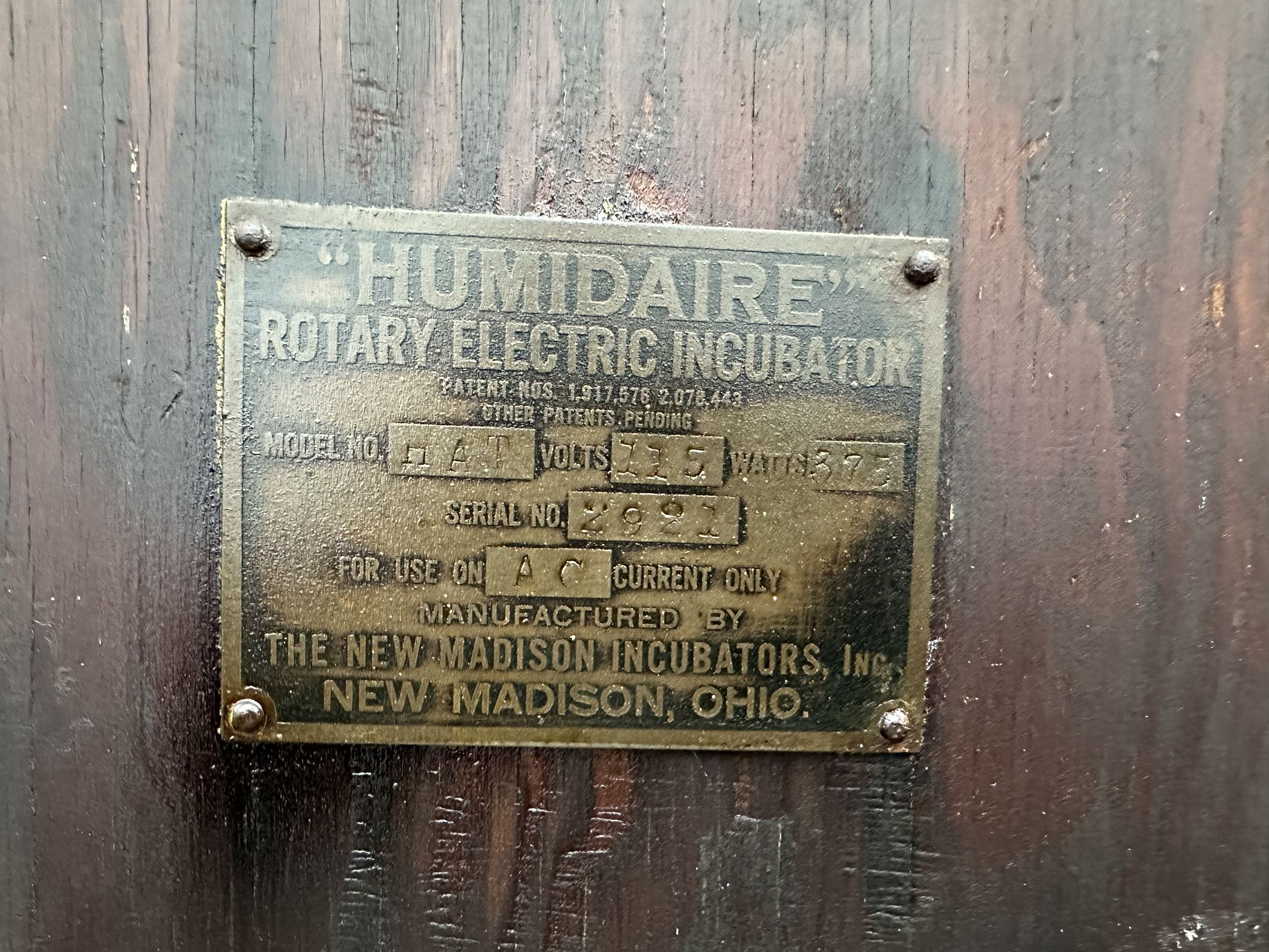 The “humidaire”, Model - HAT, 375 watts/115 volts, ac current only, serial #2921