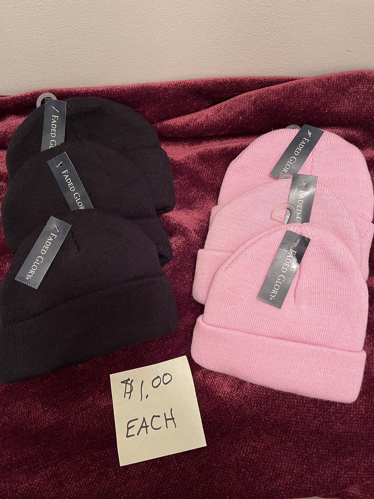 NEW Pink or Black Knit caps for infant or toddlers. One size fits all. My mother bought them at Walmart. Faded Glorybrand. Local buyers please $1.00 each.